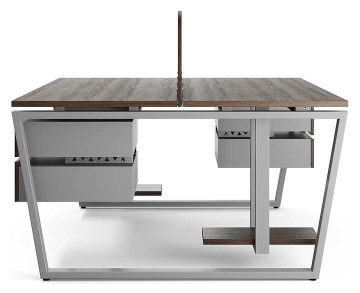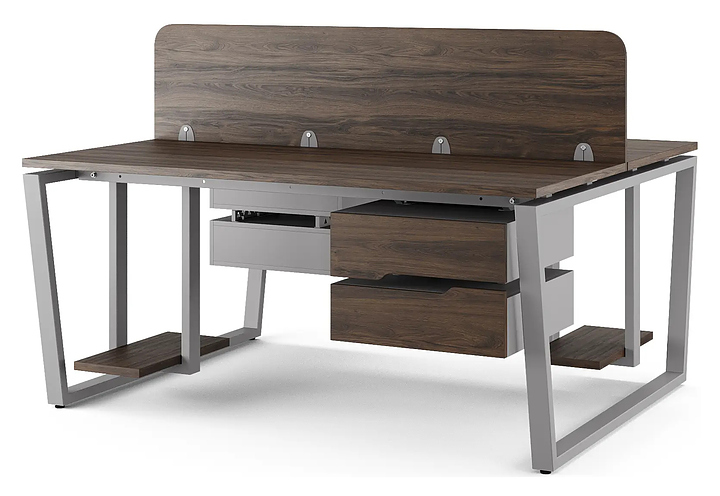 Офисный стол Кобор OTR/2-100/120 aluminum/charlston на 2 рабочих места используется в офисных помещениях и кабинетах руководителей. Модель оснащена опорами в форме обратной трапеции. Каркас и опоры выполнены из металла, выкрашенного в цвет алюминиевый металлик (RAL9006), столешница – из ламинированной древесно-стружечной плиты (ЛДСП) цвета дуб чарльстон (H3154 ST36). Дополнительные характеристики: