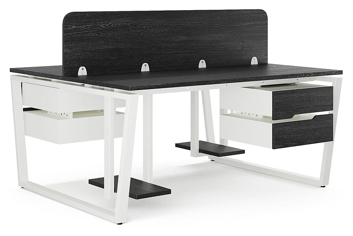 Офисный стол Кобор OTR/2-100/120 white/glazed на 2 рабочих места используется в офисных помещениях и кабинетах руководителей. Модель оснащена опорами в форме обратной трапеции. Каркас и опоры выполнены из металла, выкрашенного в цвет белый муар (RAL9016), столешница – из ламинированной древесно-стружечной плиты (ЛДСП) цвета черный дуб (H3178 ST37). Дополнительные характеристики: