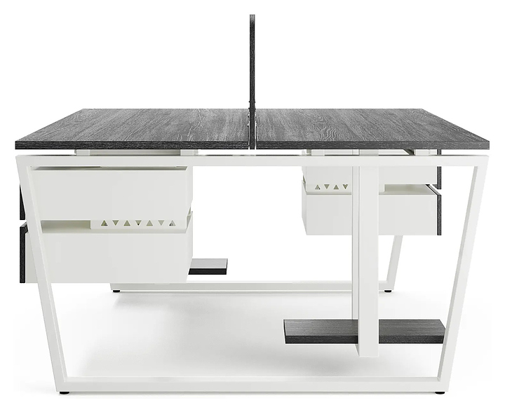 Офисный стол Кобор OTR/2-80/140 white/glazed на 2 рабочих места используется в офисных помещениях и кабинетах руководителей. Модель оснащена опорами в форме обратной трапеции. Каркас и опоры выполнены из металла, выкрашенного в цвет белый муар (RAL9016), столешница – из ламинированной древесно-стружечной плиты (ЛДСП) цвета черный дуб (H3178 ST37). Дополнительные характеристики: