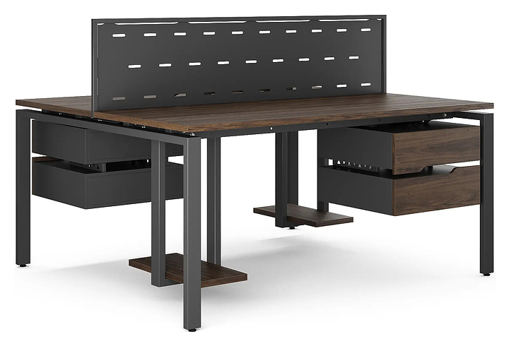 Офисный стол Кобор P/2-100/120 black/charlston на 2 рабочих места используется в офисных помещениях и кабинетах руководителей. Модель оснащена П-образными опорами. Каркас и опоры выполнены из металла, выкрашенного в цвет черный муар (RAL9005), столешница – из ламинированной древесно-стружечной плиты (ЛДСП) цвета дуб чарльстон (H3154 ST36). Дополнительные характеристики: