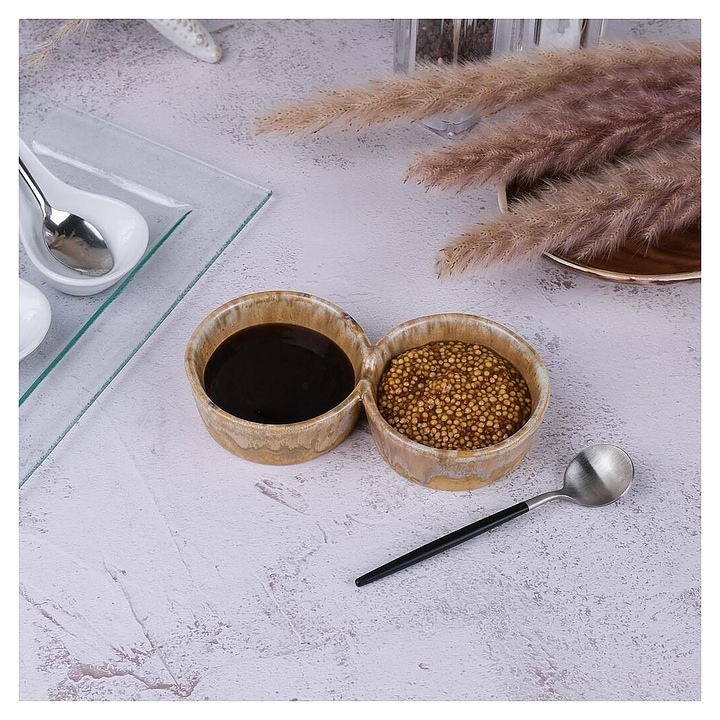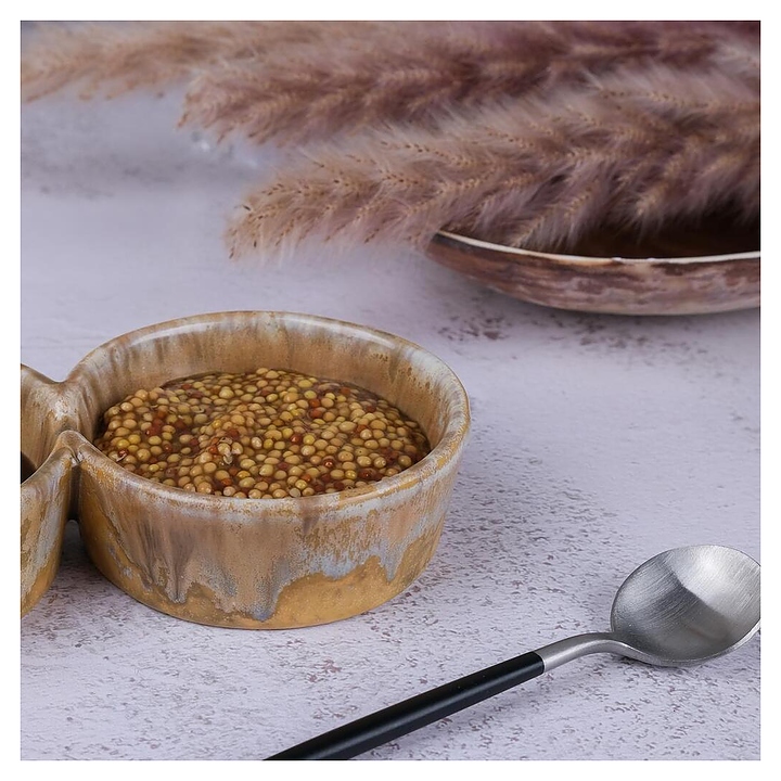 Менажница P.L. Proff Cuisine Light Brown Frutti di Mare B240011216-2401A используется в барах, ресторанах, на других предприятиях общественного питания и в домашних условиях для совместной подачи нескольких соусов. Модель оснащена 2 секциями круглого сечения. Изделие выполнено из высококачественной керамики с покрытием реактивной глазурью в светло-коричневой цветовой гамме. Цена указана за 1 шт. Дополнительные характеристики: