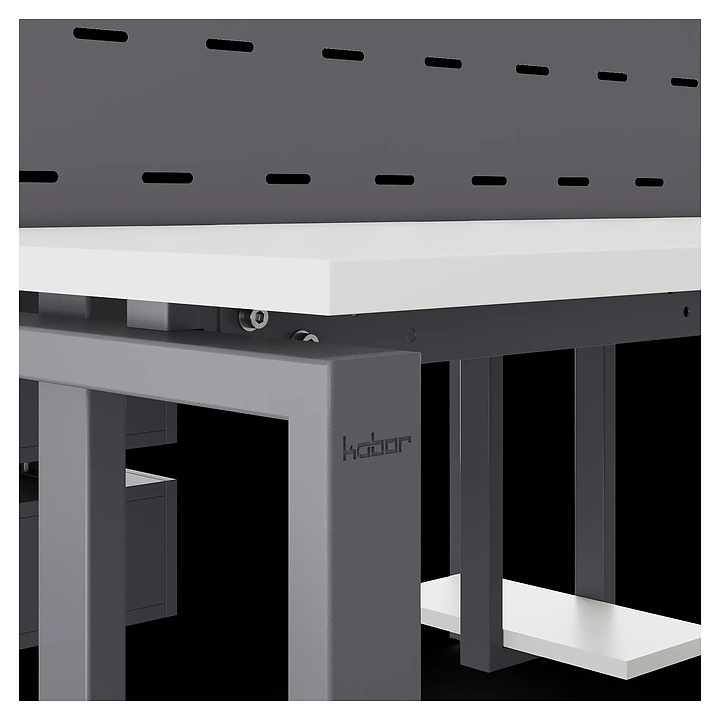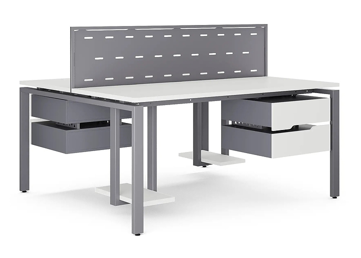 Офисный стол Кобор P/2-100/120 graphite/premium на 2 рабочих места используется в офисных помещениях и кабинетах руководителей. Модель оснащена П-образными опорами. Каркас и опоры выполнены из металла, выкрашенного в цвет графит муар (RAL7024), столешница – из ламинированной древесно-стружечной плиты (ЛДСП) цвета белый премиум (W1000 ST9). Дополнительные характеристики: