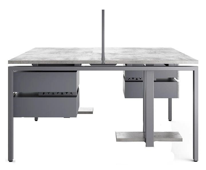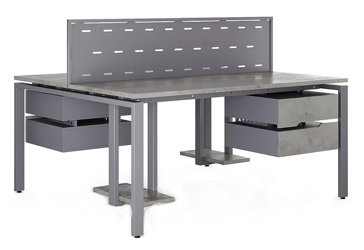 Офисный стол Кобор P/2-100/120 graphite/chicago на 2 рабочих места используется в офисных помещениях и кабинетах руководителей. Модель оснащена П-образными опорами. Каркас и опоры выполнены из металла, выкрашенного в цвет графит муар (RAL7024), столешница – из ламинированной древесно-стружечной плиты (ЛДСП) цвета бетон чикаго (F186 ST9). Дополнительные характеристики:
