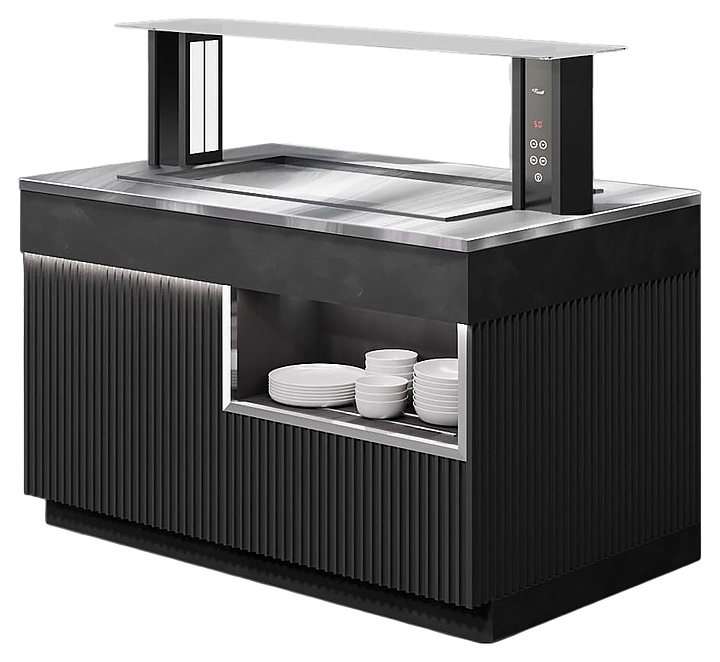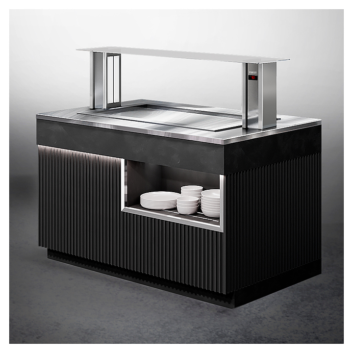 Шведский стол Finist ШСх1175 используется в гостиницах, на предприятиях общественного питания и торговли для кратковременного хранения, демонстрации и раздачи путем самообслуживания различных охлажденых закусок и блюд. Модель оснащена подставкой с встроенным холодильным агрегатом, охлаждаемой столешницей и панелью управления. Столешница выполнена из высококачественной нержавеющей стали, облицовочные панели корпуса – из МДФ с покрытием дизайна «Сидней» черного цвета, верхняя полка – из просветленного стекла. Посуда не входит в комплект поставки и приобретаются отдельно. Особенности: