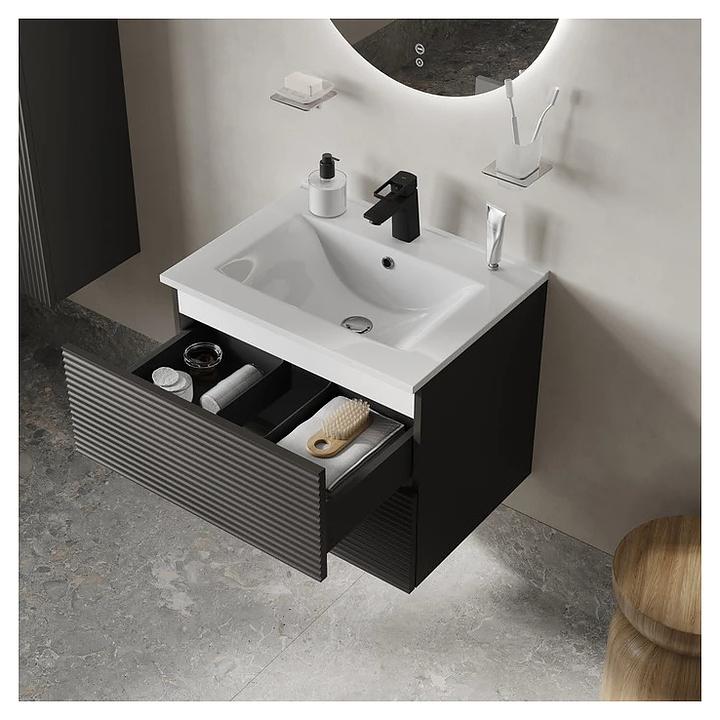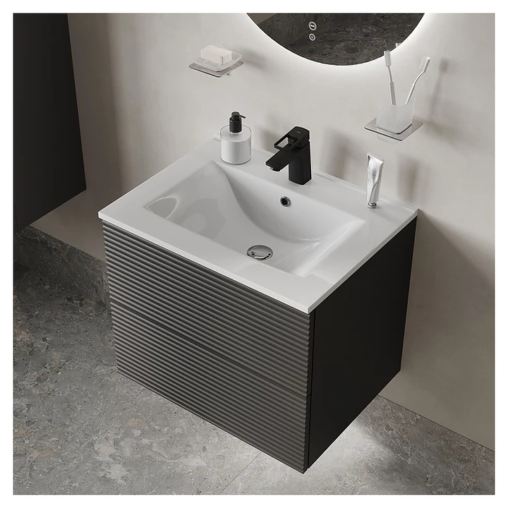 Тумба подвесная с умывальником IDDIS Bild BIL60G0i95K разработана для использования в помещениях с высокой влажностью и сохранит первоначальный вид мебели надолго. Благодаря подвесной конструкции изделие не занимает много места и обеспечивает легкую уборку в ванной комнате. Модель оснащена двумя выдвижными ящиками и керамическим умывальником с переливом, с высоким бортом и большой вместительной чашей в комплекте. Комплектация: