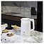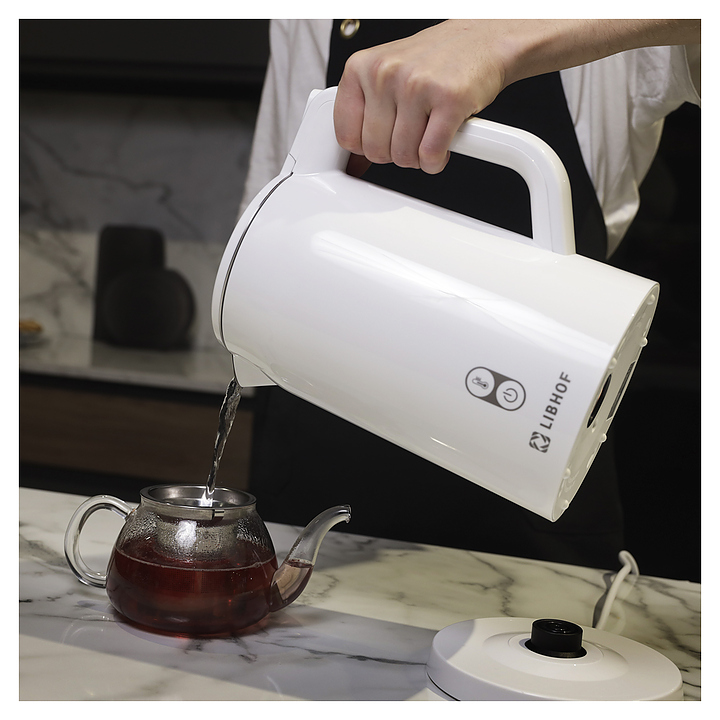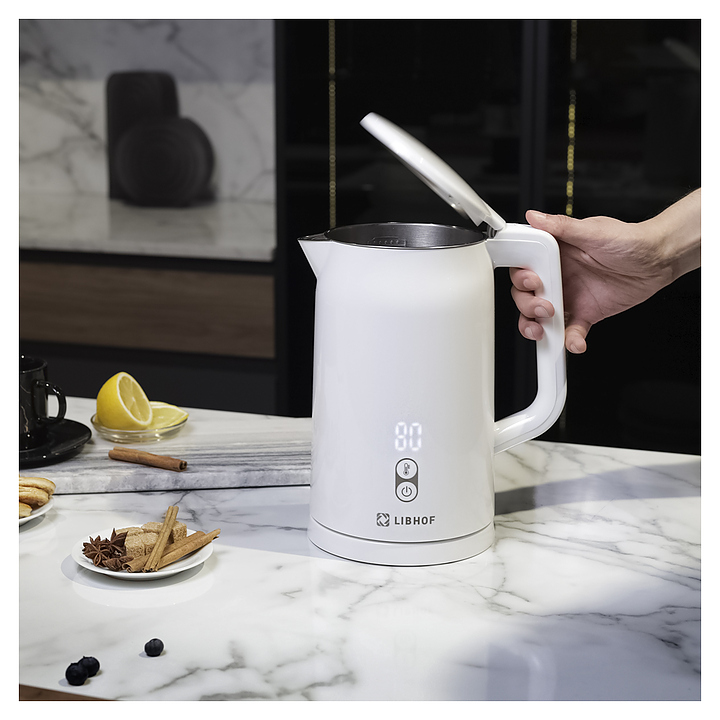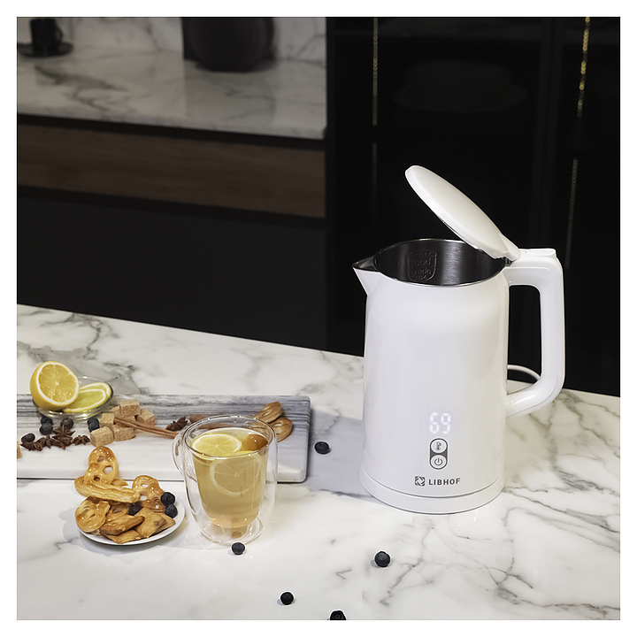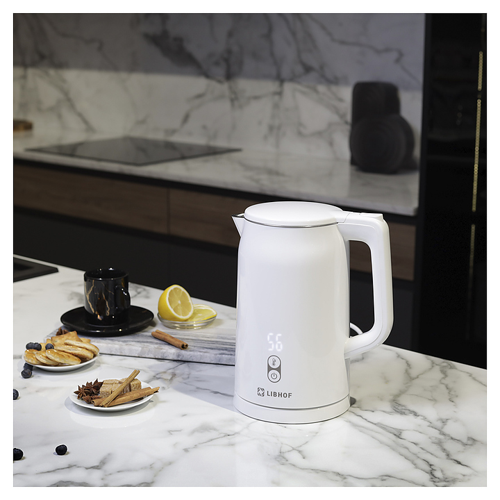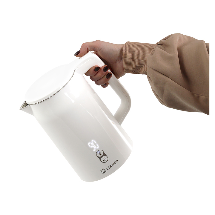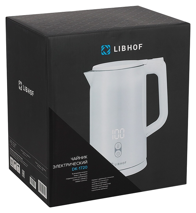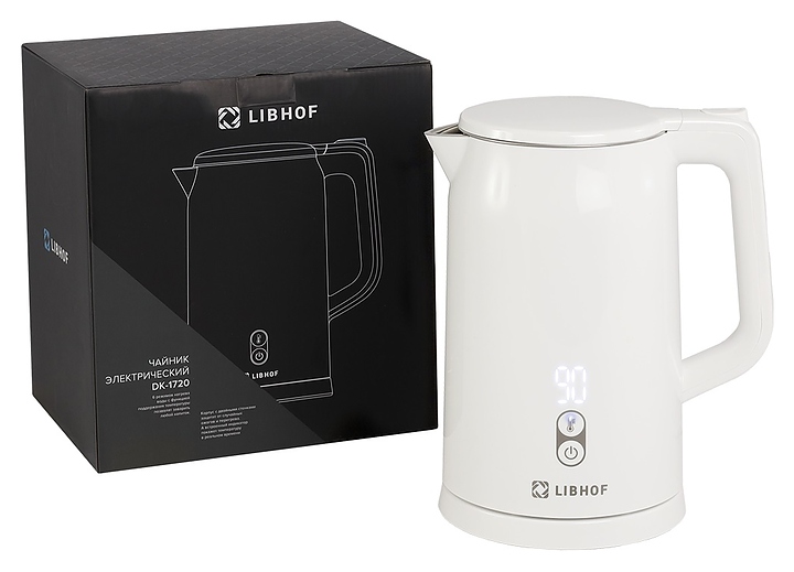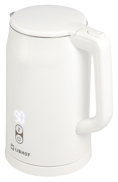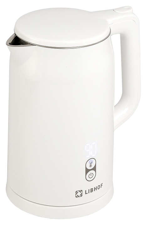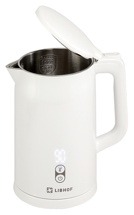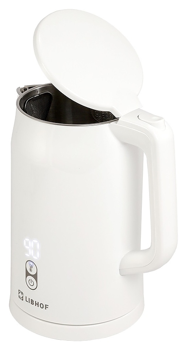 Электрический чайник Libhof DK-1720 предназначен для подогрева воды и приготовления горячих напитков в отелях, офисах и домашних условиях. Модель оснащена круглой подставкой, кабелем питания с вилкой, откидной крышкой, интегрированным в кромку емкости изливом, дугообразной рукояткой, расположенными на стенке сенсорной панелью управления и светодиодным цифровым дисплеем с белой подсветкой индикации. Подставка, внешняя облицовка корпуса и крышки выполнены из белого пластика, бесшовная внутренняя облицовка корпуса и крышки – из высококачественной пищевой нержавеющей стали марки SUS304. Особенности: