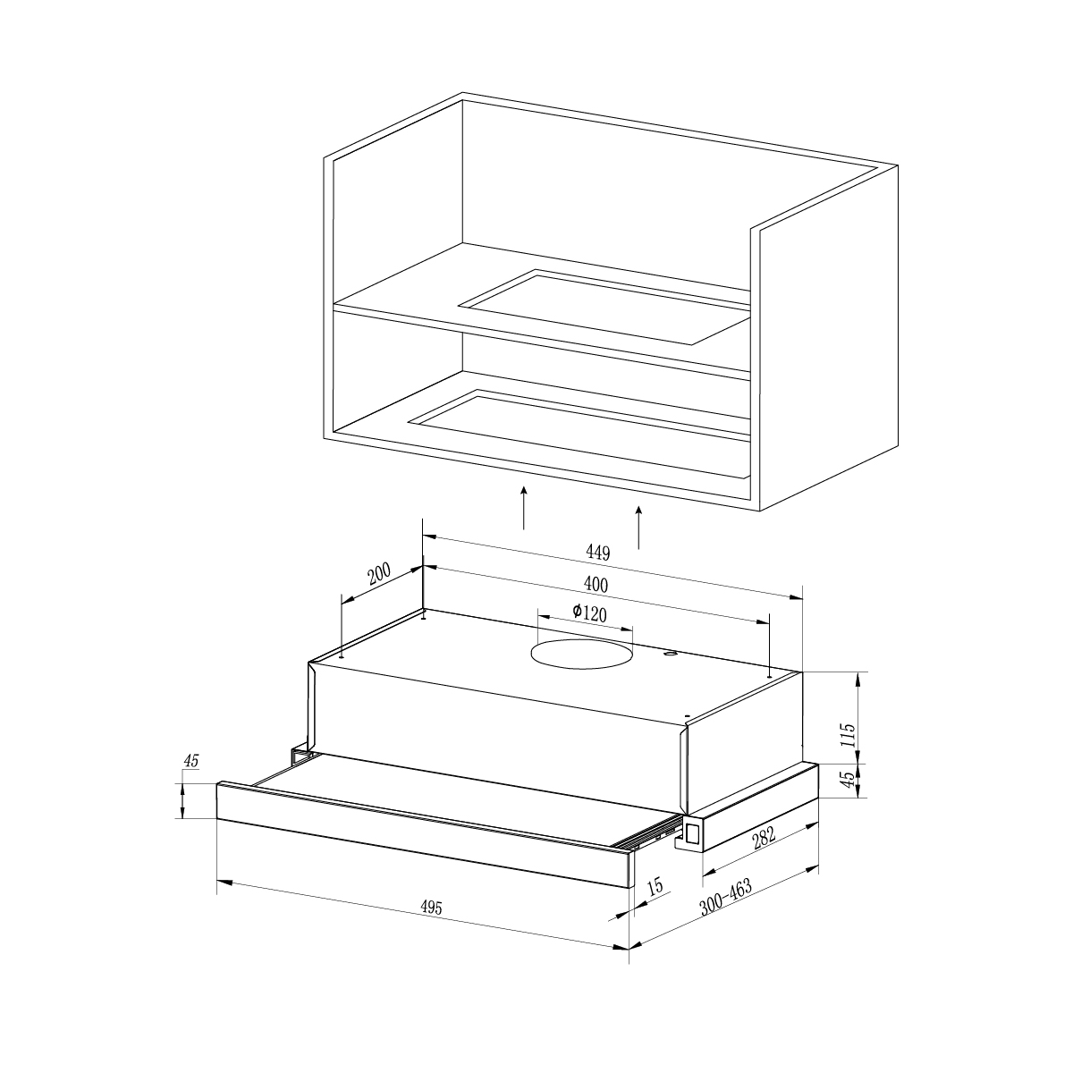 Встраиваемая кухонная вытяжка Libhof LH-0950 silver предназначена для очистки воздуха от продуктов горения, копоти и запахов в процессе приготовления пищи путем принудительной вентиляции в домашних условиях. Модель оснащена вентилятором с электродвигателем, кабелем питания с вилкой, прямоугольным светодиодным светильником и электромеханической панелью управления с переключателями колыбельного типа. Корпус прямоугольно ориентированной формы выполнен из высококачественной стали с термостойким покрытием эмалью серебристого оттенка, жироулавливающий фильтр – из алюминия. В комплект поставки входят набор монтажных креплений, 2-лепестковый антивозвратный клапан, инструкция по эксплуатации, гарантийный талон и заводская упаковка. Особенности: