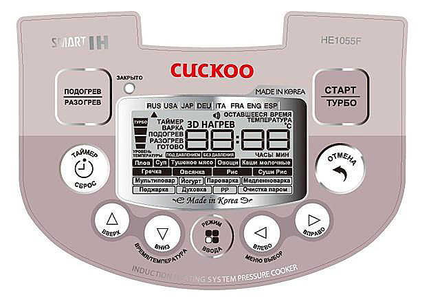 Мультиварка Cuckoo CMC-HE1055F предназначена для тушения, варки, приготовления на пару, обжаривания, запекания и выпечки, а также оснащена специальным режимом для приготовления домашнего йогурта в частных домах, квартирах и т.д. Модель оснащена электронной панелью управления. В комплект поставки входят ложка, мерный стаканчик, паровая пластина, спица для очистки каналов выпуска пара, книга на 257 рецептов и инструкция. Особенности: