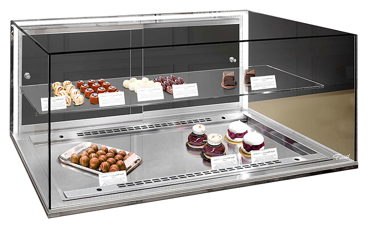 Встраиваемая горизонтальная витрина Finist Glassier G812-12/50/5 предназначена для кратковременного хранения и предпродажной демонстрации десертов, шоколадных изделий, конфет или пралине на предприятиях общественного питания и торговли. Модель оснащена 2 дверьми со стороны продавца, полкой, светодиодной подсветкой и может монтироваться в столешницу из любого материала. Купол витрины имеет большую площадь остекления, что помогает беспрепятственно разглядеть товар со всех сторон. Каркас и столешница выполнены из зеркальной нержавеющей стали, купол - из просветленного стекла, полка - из стекла и агрегатная часть - из крашеной стали. Особенности: