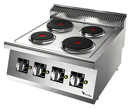 Электрическая плита VITAL EKO6020 серии 600 предназначена для приготовления различных блюд из мяса, птицы, рыбы и овощей в наплитной посуде на предприятиях общественного питания и торговли. Модель оснащена 4 круглыми конфорками, прессованным монолитным верхним столом и 6-ступенчатыми тепловыми переключателями. Закругленные края столешницы обеспечивают легкую чистку. Корпус выполнен из нержавеющей стали. Особенности: