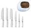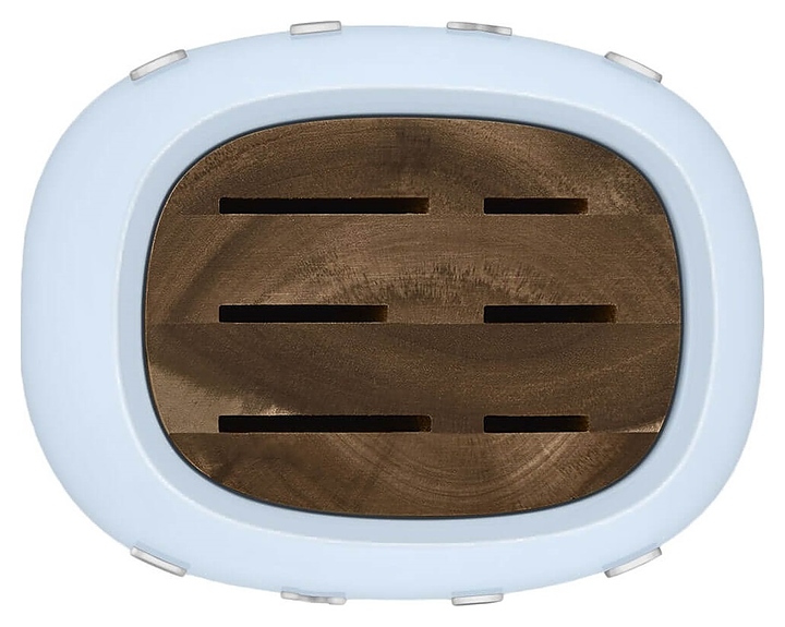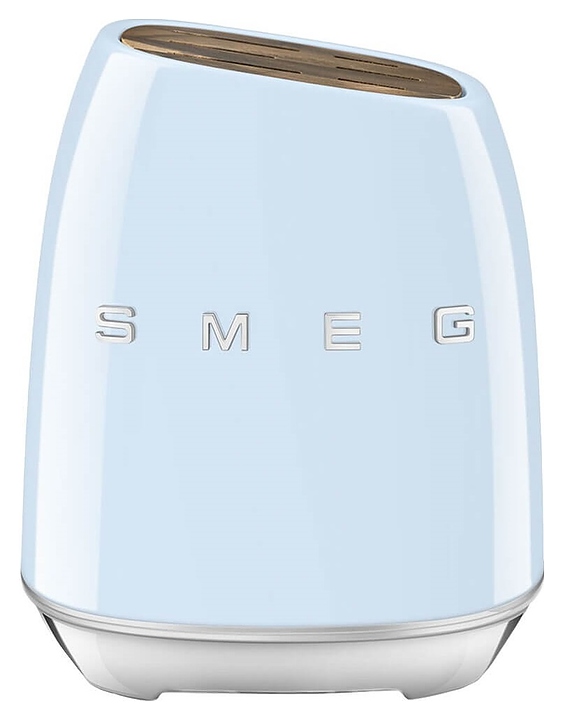 Набор кухонных ножей SMEG KBSF02PB предназначен для нарезки различных продуктов в домашних условиях. Коллекция Стиль 50-х годов представляет бытовые приборы и аксессуары с винтажным декором. Ножи оснащены острыми лезвиями и рукоятками с удобным захватом, подставка. Ножи выполнены из высококачественной нержавеющей стали (Германия), подставка – расположенным под наклоном держателем с узкими пазами и устойчивым основанием с нескользящими опорами, корпус подставки обтекаемой выпуклой формы – из нержавеющей стали с глянцевым покрытием пастельного голубого оттенка, основание подставки и накладные литеры логотипа – из пластика с поверхностью оттенка полированный хром, держатель – из древесины акации. Комплектация: