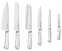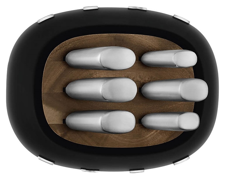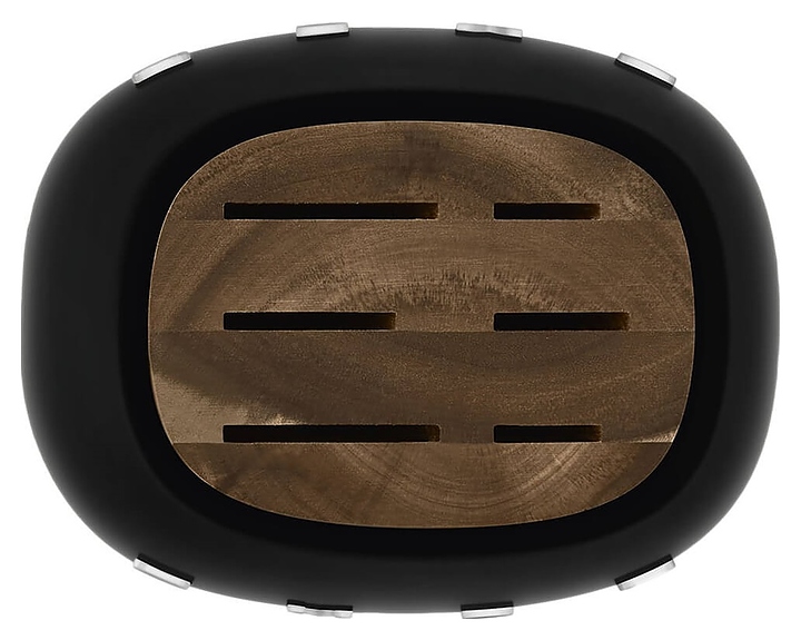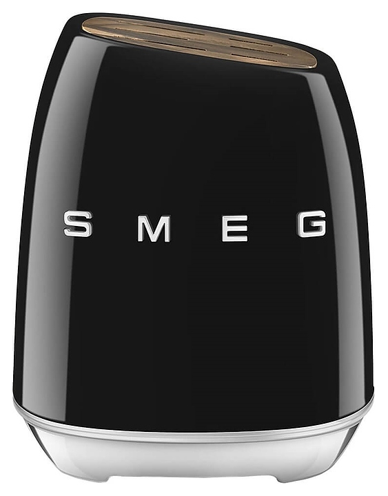 Набор кухонных ножей SMEG KBSF02BL предназначен для нарезки различных продуктов в домашних условиях. Коллекция Стиль 50-х годов представляет бытовые приборы и аксессуары с винтажным декором. Ножи оснащены острыми лезвиями и рукоятками с удобным захватом, подставка. Ножи выполнены из высококачественной нержавеющей стали (Германия), подставка – расположенным под наклоном держателем с узкими пазами и устойчивым основанием с нескользящими опорами, корпус подставки обтекаемой выпуклой формы – из нержавеющей стали с глянцевым покрытием черного цвета, основание подставки и накладные литеры логотипа – из пластика с поверхностью оттенка полированный хром, держатель – из древесины акации. Комплектация: