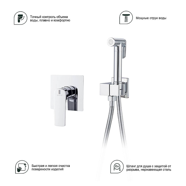 Гигиенический душ Splenka S30.53 предназначен для подачи горячей и холодной воды в туалетных комнатах. Керамический картридж обеспечивает плавный ход рычага смесителя, контроль и точность при выборе напора и температуры воды. Корпус выполнен из высококачественной латуни, отличающейся прочностью, долговечностью и устойчивостью к перепадам температуры, лейка - из ABS пластика, шланг - из металла. В комплект поставки входят внутренняя часть, 1-режимная лейка и шланг. Особенности: