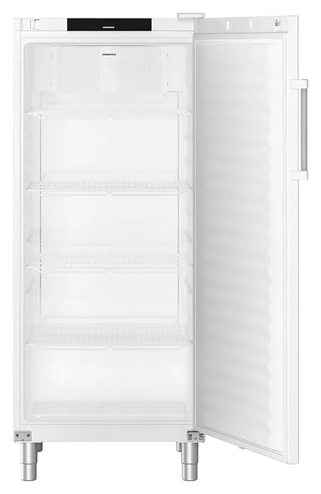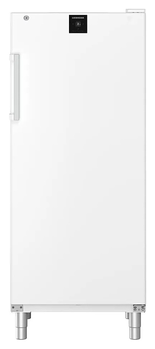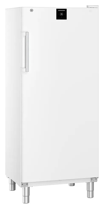 Холодильный шкаф Liebherr FRFvg 5501 серии Performance предназначен для охлаждения и хранения пищевых продуктов и напитков на предприятиях общественного питания и торговли. Модель оснащена холодильной камерой c правосторонней глухой распашной дверью с короткой вертикальной рукояткой, кабелем питания с вилкой, 4 массивными цилиндрическими опорами, расположенными в верхней части фронта за дверью и на фасаде двери сенсорными панелями управления с дисплеями индикации. Фасад двери и боковины выполнены из стали с лакированным антикоррозийным покрытием белого цвета, внутренняя облицовка камеры – из белого полистирола для профессионального применения, рукоятка – из алюминия, опоры – из нержавеющей стали с серебристой поверхностью, полки – из металла с полимерным покрытием, упаковка – из гофрокартона, полимерной пленки и полистирола.