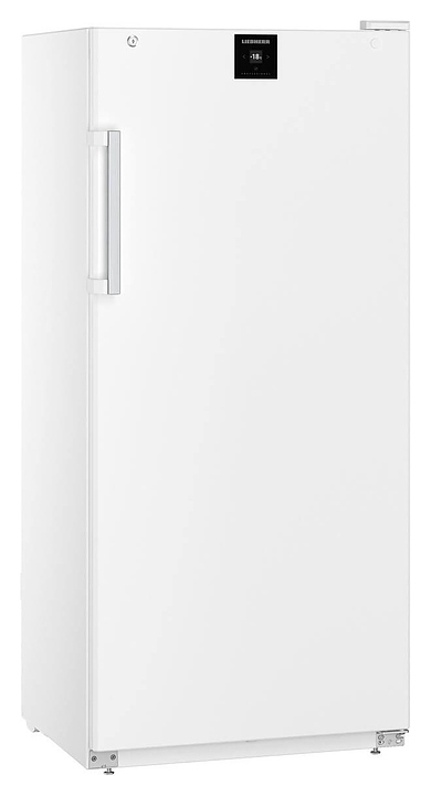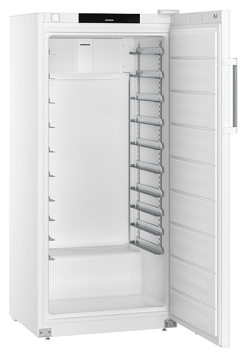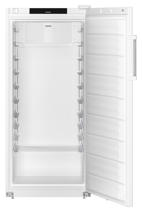 Холодильный шкаф Liebherr BRFvg 5501 серии Performance предназначен для охлаждения и хранения заготовок из теста в пекарнях и аналогичных предприятиях пищевой промышленности. Модель оснащена холодильной камерой c боковыми стойками с L-образными направляющими для размещения противней, правосторонней глухой распашной дверью с короткой вертикальной рукояткой, кабелем питания с вилкой, 4 опорами, расположенными в верхней части фронта за дверью и на фасаде двери сенсорными панелями управления с дисплеями индикации. Боковины и фасад двери выполнены из стали с лакированным антикоррозийным покрытием белого цвета, внутренняя облицовка камеры – из белого полистирола для профессионального применения, рукоятка – из алюминия, опоры – из оцинкованной стали, направляющие – из хромникелевой нержавеющей стали марки AISI 304, полка – из металла с полимерным покрытием, упаковка – из гофрокартона, полимерной пленки и полистирола.