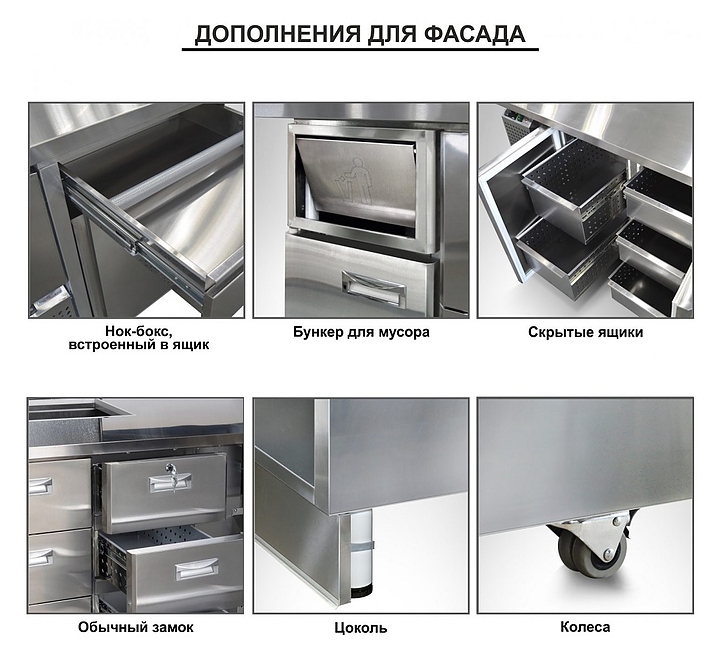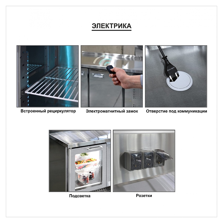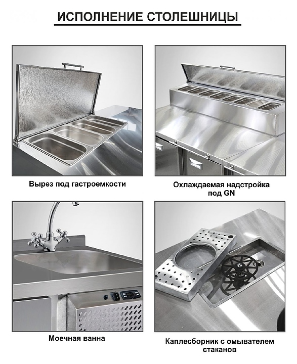 Среднетемпературный холодильный стол для салатов (саладетта) Finist СХСнс-600-4 1/3 предназначен для обеспечения сохранности и свежести составляющих для холодных закусок и салатов на предприятиях общественного питания и торговли. Модель оснащена микропроцессорным блоком управления, 4 дверями и 11 гастроемкостями GN1/3 с крышками. Корпус и столешница выполнены из нержавеющей стали. Вместо любой секции с дверью возможно установить секцию с двумя или тремя ящиками. Производитель оставляет за собой право менять исполнение ручек на холодильных столах. Внимание! На фото аналогичные модели в другой комплектации. Особенности:
