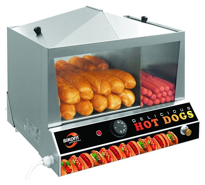 Паровой гриль Sicom МК-1.35 готовит хот-доги под воздействием пара. Аппарат выполняет сразу две функции: гриля для приготовления блюд и тепловой витрины для поддержания их в теплом состоянии. Кроме этого в нем можно разогревать любые мучные изделия и полуфабрикаты. Корпус гриля для сосисок выполнен в виде герметичной ванны, которая продолжается высокими стенками, две из которых — стеклянные. В ванне расположен нагревательный элемент (ТЭН). Над ТЭНом, между двумя горизонтальными решетками, установлен поддон с поворотным шибером для контроля поступающего пара. Внутренний объем камеры поделен на две части: бункеры для закладки сосисок и булочек. Сверху гриль закрывается сдвоенной съемной крышкой, через которую кладутся продукты в отсеки. Органы управления и индикации расположены на боковой поверхности корпуса. Особенности: