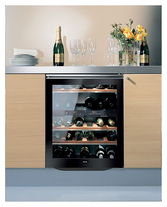 Винный шкаф от Miele с регулировкой температуры. Его можно установить под столешницу,. Дверца из затемненного стекла защищает капризное вино от воздействия света. Эргономичные деревянные полочки выдвигаются, облегчая извлечение бутылок.