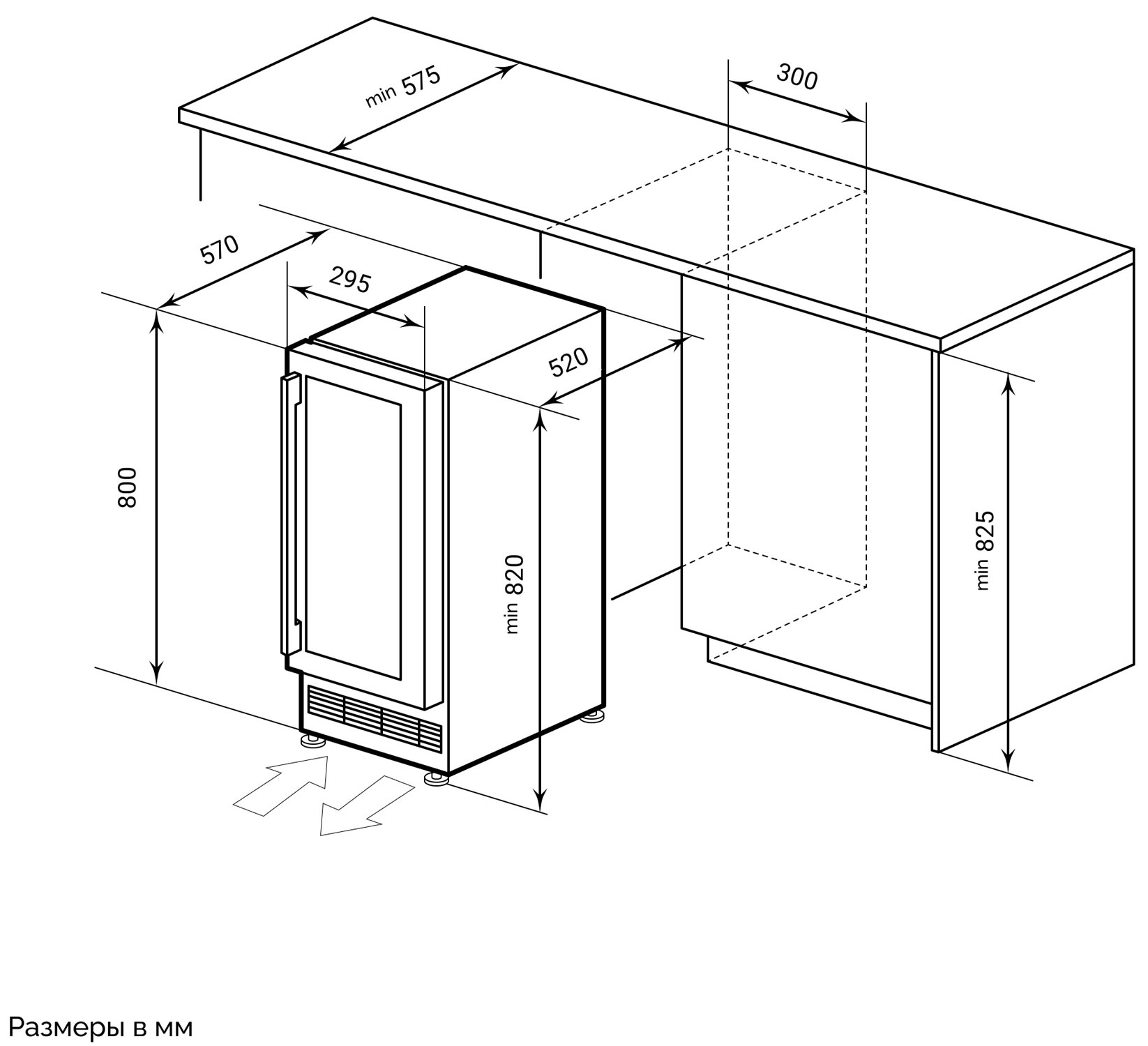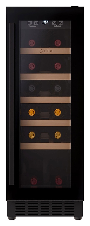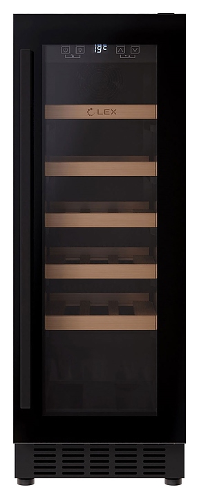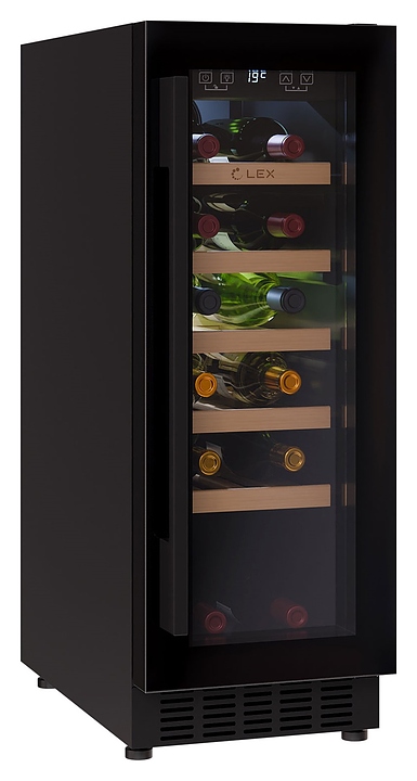 Винный шкаф Lex LWD3020BL предназначен для хранения при оптимальных условиях бутилированного вина различных сортов в барах, ресторанах, специализированных магазинах, подсобных складских помещениях, а также домашних условиях. Модель оснащена монотемпературной холодильной камерой с интегрированными направляющими для полок, правосторонней распашной дверью на перенавешиваемых петлях с длинной уплощенной вертикальной рукояткой и обзорным остеклением, цокольной вентиляционной решеткой, кабелем питания, расположенной внутри камеры электронной панелью управления с сенсорными функциональными клавишами и цифровым светодиодным дисплеем с белой подсветкой индикации. Корпус выполнен из металла с антикоррозийным покрытием, дверь с полным фронтальным остеклением без винтового крепежа, рама двери и внутренняя облицовка камеры черного цвета, рукоятка – из металла с матовым покрытием черного цвета, остекление – из закаленного стекла с дымчатой тонировкой, полки – из массива буковой древесины с фронтальной гравировкой логатипа. В комплект поставки входят 5 съемных полок с направляющими для размещения бутылок, набор крепежа, инструкция по эксплуатации, гарантийный талон и заводская упаковка. Особенности: