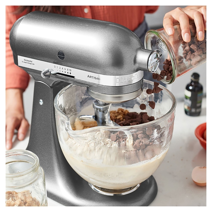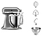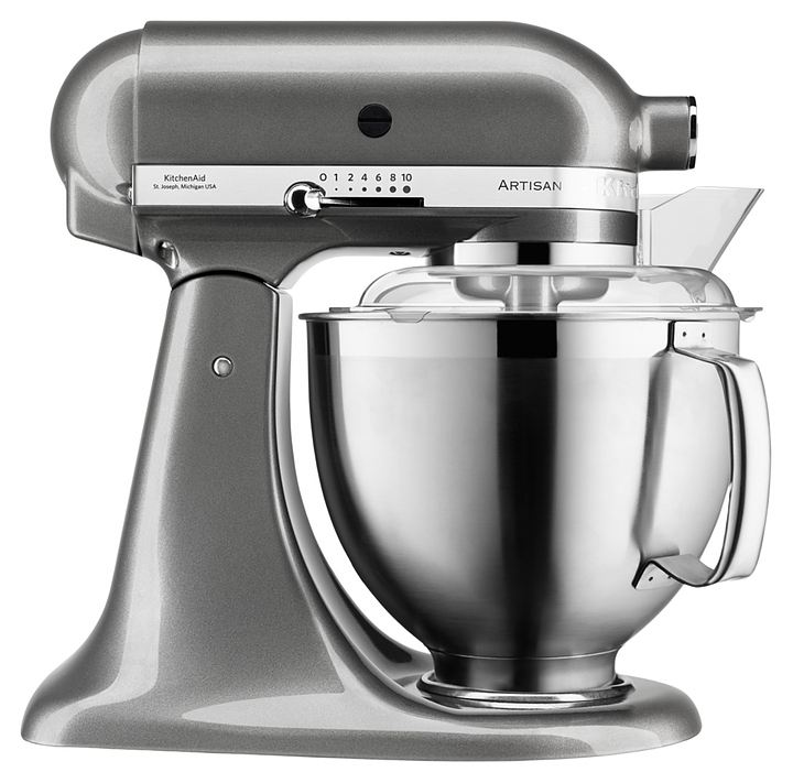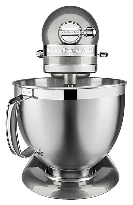Настольный планетарный миксер KitchenAid Artisan 5KSM185PSEMS используется в домашних условиях для замеса теста различной консистенции, в том числе белкового, заварного, дрожжевого, бисквитного, а также приготовления пюре, кремов, муссов и соусов. Механизм вращения месильного органа аналогичен поступательно-вращательному движению планет, причем насадка вращается вдоль своей оси в противоположном направлении поступательному движению, таким образом ингредиенты тщательно перемешиваются в однородную массу. Модель оснащена электродвигателем переменного тока, подъемной (откидной) головкой моторного блока, кабелем питания с вилкой и электромеханической панелью управления. Литой корпус обтекаемой формы выполнен из цинка с покрытием эмалью оттенка серебряный медальон (Medallion Silver) и декоративной серебристой полосой с логотипом по периметру нижней части головки, рукоятки управления – из металла с хромированной поверхностью, чаши – из нержавеющей стали с серебристой поверхностью и матовой текстурой внешней стороны борта, насадки – из нержавеющей стали, защитный обод – из пластика. Комплектация:
