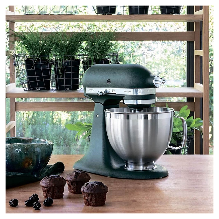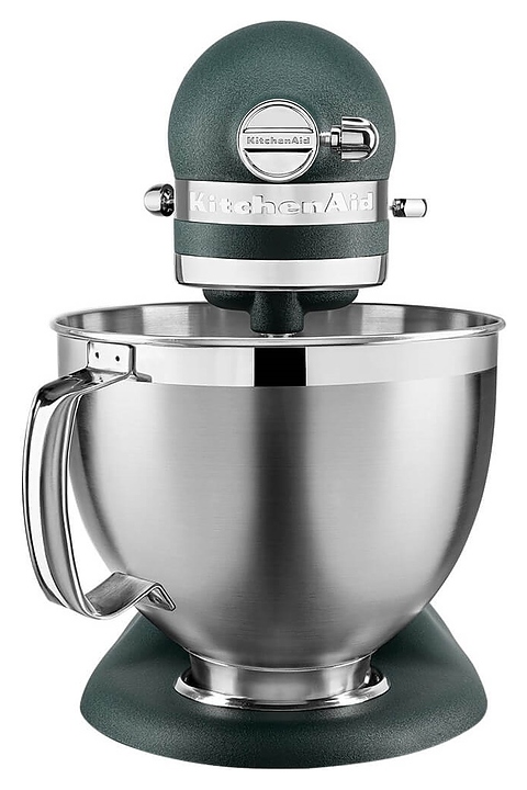 Настольный планетарный миксер KitchenAid Artisan 5KSM185PSEPP используется в домашних условиях для замеса теста различной консистенции, в том числе белкового, заварного, дрожжевого, бисквитного, а также приготовления пюре, кремов, муссов и соусов. Механизм вращения месильного органа аналогичен поступательно-вращательному движению планет, причем насадка вращается вдоль своей оси в противоположном направлении поступательному движению, таким образом ингредиенты тщательно перемешиваются в однородную массу. Модель оснащена электродвигателем переменного тока, подъемной (откидной) головкой моторного блока, кабелем питания с вилкой и электромеханической панелью управления. Литой корпус обтекаемой формы выполнен из цинка с покрытием эмалью оттенка зернистый пальмовый (Pebbled Palm) и декоративной серебристой полосой с логотипом по периметру нижней части головки, рукоятки управления – из металла с хромированной поверхностью, чаши – из нержавеющей стали с серебристой поверхностью и матовой текстурой внешней стороны борта, насадки – из нержавеющей стали, защитный обод – из пластика. Комплектация: