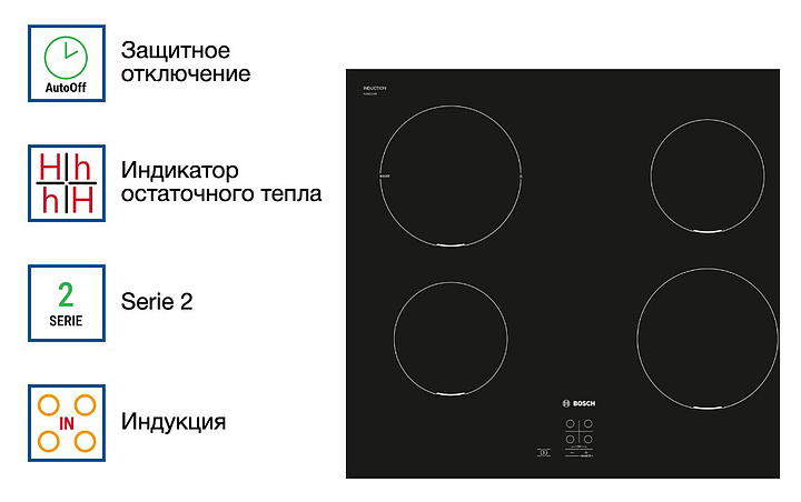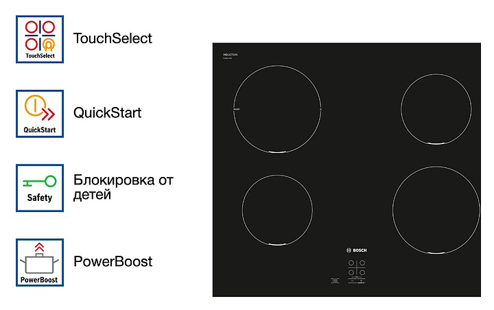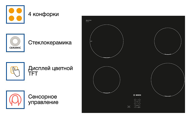 Варочная панель Bosch PUG611AA5E предназначена для приготовления большого ассортимента блюд в наплитной посуде в домашних условиях. Модель оснащена сенсорной системой управления TouchSelect, дисплеем TFT и таймером с функцией отключения для каждой конфорки. Индукционная технология обеспечивает передачу до 90% энергии непосредственно посуде, что значительно экономит электроэнергию по сравнению с традиционными плитами. Отсутствие открытого огня и минимальный нагрев окружающей среды делают приготовление пищи более безопасным и комфортным. Поверхность выполнена из стеклокерамики. Особенности: