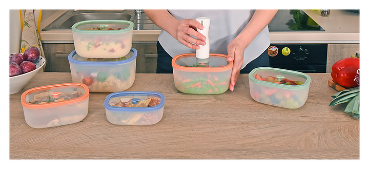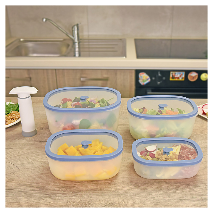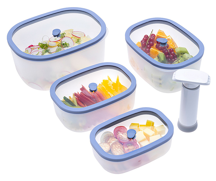 Набор вакуумных контейнеров Status Fresko set 5 lilac используется в частных домах и квартирах для упаковки продуктов и последующего их длительного хранения. Благодаря использованию вакуума, продукты не подвергаются воздействию кислорода, срок их хранения значительно увеличивается, продукты сохраняют свои вкусовые качества и аромат, запахи в холодильнике не смешиваются. Модель имеет прямоугольную форму. Изделие выполнено из полипропилена без BPA, крышка - из стекла. В комплект поставки входят 4 контейнера разного объема и насос для вакуумирования. Характеристики: