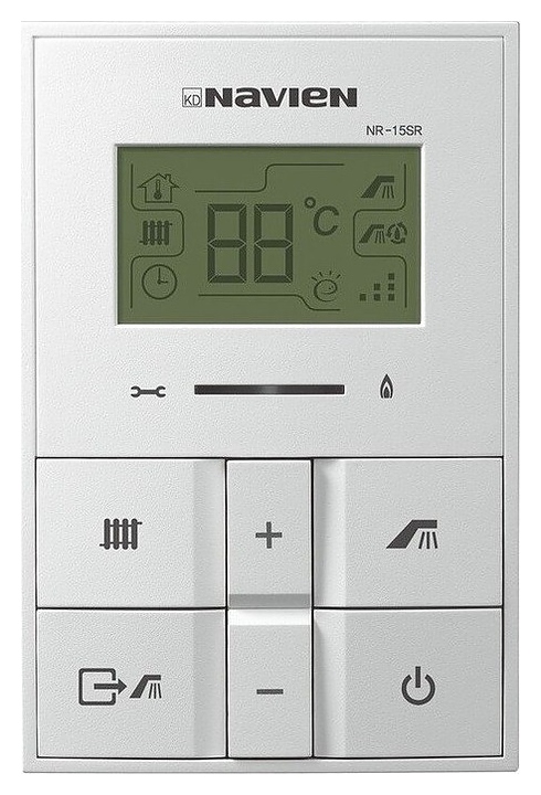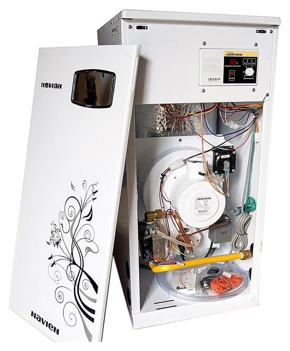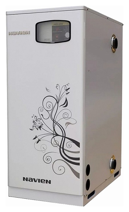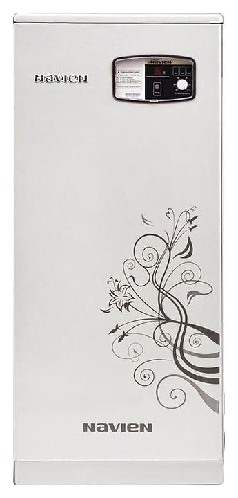 Газовый отопительный котел Navien GST-49KN используется в системах водоснабжения и отопления для обогрева помещений и нагрева воды для хозяйственных нужд в жилых и загородных частных домах, а также других бытовых и хозяйственных объектах. Модель оснащена газогорелочным устройством, бойлером теплоносителя с жаротрубным основным теплообменником и интегрированным спиральным теплообменником горячего водоснабжения (ГВС), автоматикой безопасности, патрубком дымохода и воздухозаборным отверстием сверху, расположенной в верхней части корпуса за смотровым окном в фронтальной крышке электромеханической панелью управления с цифровым дисплеем, резьбовыми штуцером для подключения газа, входным и выходным патрубками контура ГВС, патрубками подачи и обратки отопительного контура, пульт – датчиком температуры, нажимными функциональными клавишами и жидкокристаллическим дисплеем индикации. Вертикально ориентированный корпус выполнен из стали с антикоррозийным покрытием белого цвета, фронтальная панель декорирована принтом в виде цветущих ветвей в темных тонах, теплообменники – из нержавеющей стали, корпус пульта – из белого пластика.