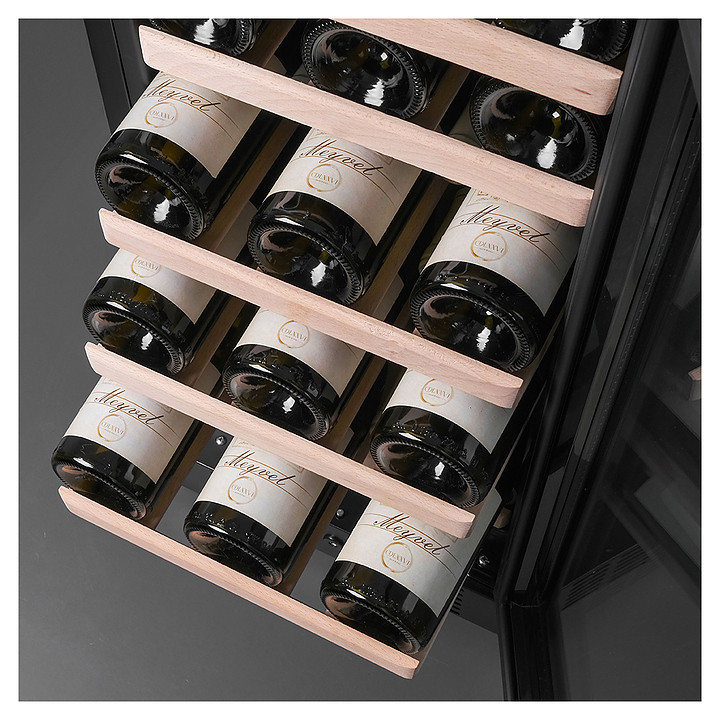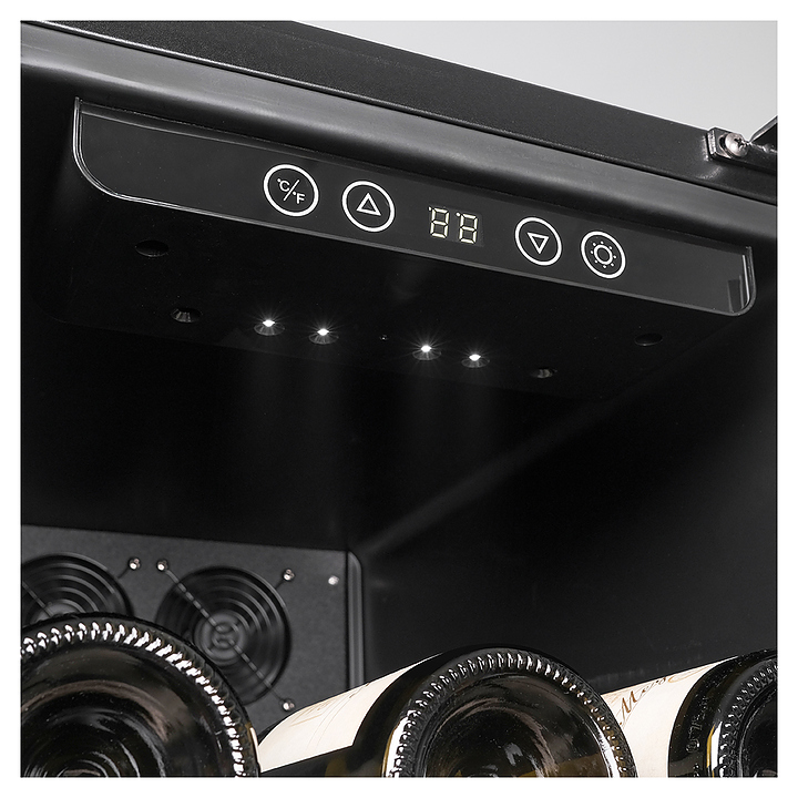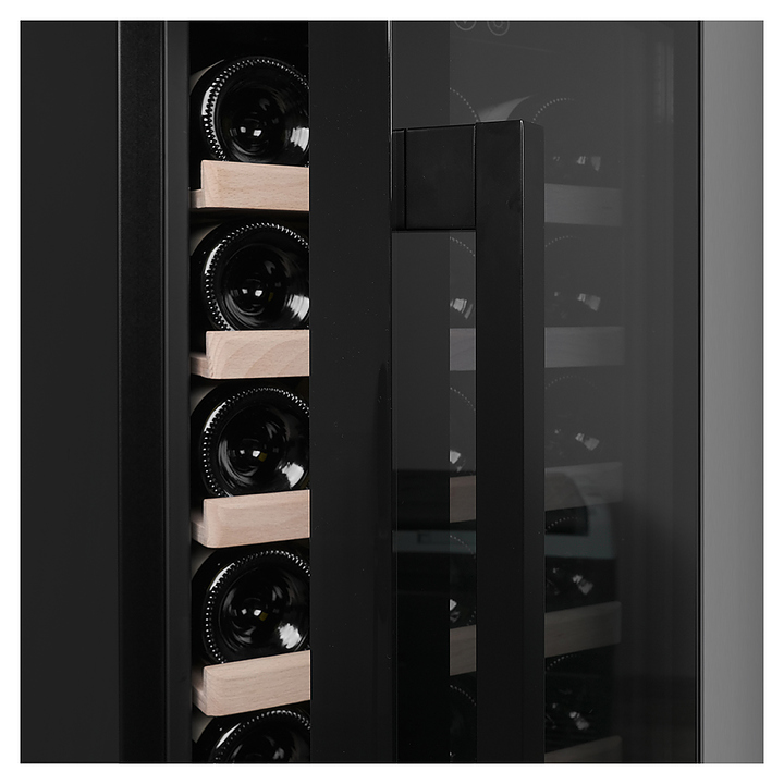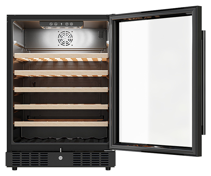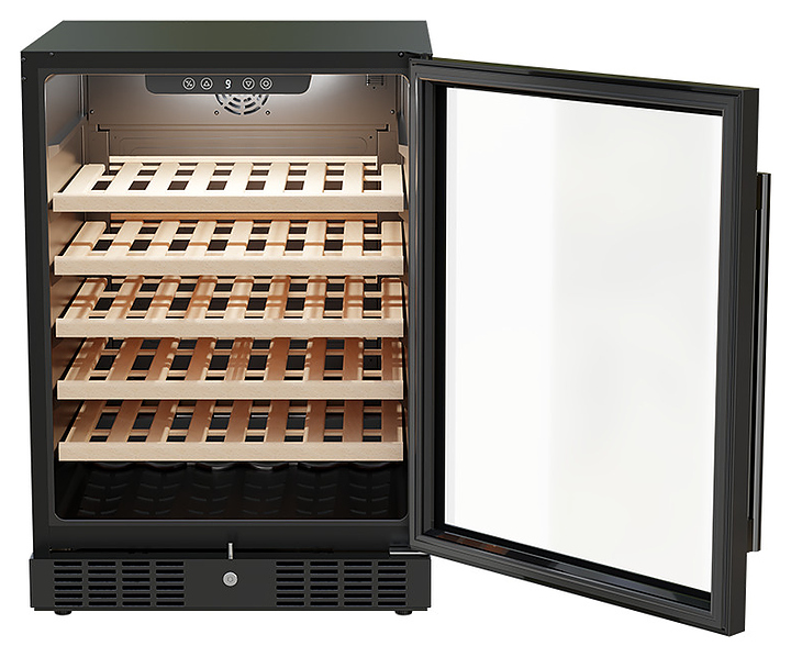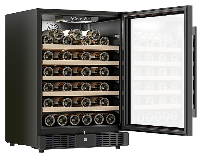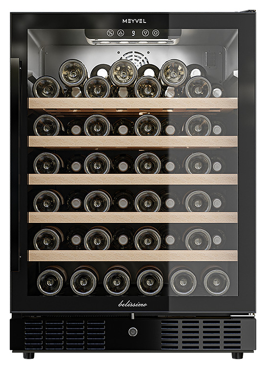 Винный шкаф MEYVEL MV52-KBT1 предназначен для демонстрации, хранения и создания оптимальных условий для сохранения всех вкусовых свойств вина в бутылках на предприятиях общественного питания, торговли, в барах, ресторанах, специализированных магазинах, частных домах или квартирах. Модель оснащена сенсорной панелью управления, электронным термостатом и светодиодной подсветкой белого цвета. Универсальная модель может использоваться как самостоятельный элемент интерьера или встраиваться под столешницу. Корпус выполнен из окрашенной в черный матовый цвет стали, дверь - из черной рамы и тонированного стекла с защитой от ультрафиолетовых лучей, выдвижные полки - из массива бука. Особенности: