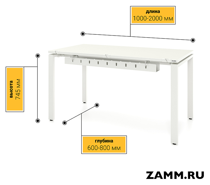 Прямой офисный стол ZAMM 60х30 серии Формат ТР используется для организации рабочего пространства в офисных помещениях. Коллекция отличается современным дизайном и сочетает в себе стиль и функциональность, создавая современное офисное пространство, стимулирующее продуктивность. Модель оснащена столешницей прямоугольной формы и П-образными опорами с подпятниками для компенсации неровностей пола. Каркас выполнен из холоднокатаной стали с покрытием белого цвета, столешница - из высококачественной ламинированной древесно-стружечной плиты (ЛДСП) с поверхностью белого цвета. В комплект поставки входят 3 пропуска для проводов (слева, по центру, справа), с их помощью можно с легкостью менять конфигурацию расположения устройств на столе, а также съёмный кабель-канал, позволяющий удобно и быстро проложить провода от розетки до сетевого фильтра (пилота), который питает все устройства на столе. Особенности: