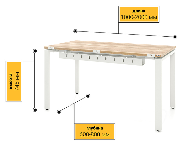 Прямой офисный стол ZAMM 60х30 серии Формат ТР используется для организации рабочего пространства в офисных помещениях. Коллекция отличается современным дизайном и сочетает в себе стиль и функциональность, создавая современное офисное пространство, стимулирующее продуктивность. Модель оснащена столешницей прямоугольной формы и П-образными опорами с подпятниками для компенсации неровностей пола. Каркас выполнен из холоднокатаной стали с покрытием белого цвета, столешница - из высококачественной ламинированной древесно-стружечной плиты (ЛДСП) с поверхностью цвета дуб бардолино. В комплект поставки входят 3 пропуска для проводов (слева, по центру, справа), с их помощью можно с легкостью менять конфигурацию расположения устройств на столе, а также съёмный кабель-канал, позволяющий удобно и быстро проложить провода от розетки до сетевого фильтра (пилота), который питает все устройства на столе. Особенности: