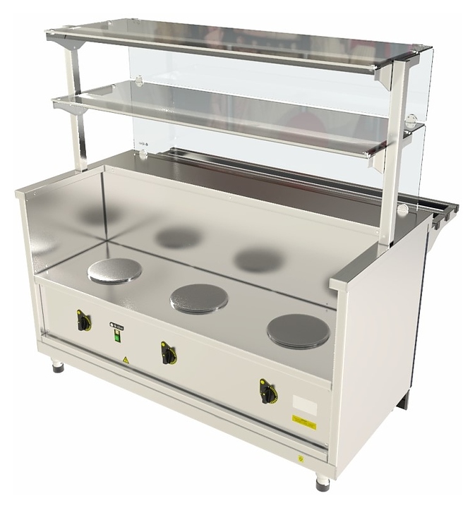 Прилавок-мармит Abat ПМЭС-70Е-03 используется в составе линии раздачи Сэйла для кратковременного хранения в горячем состоянии первых блюд в наплитных котлах и раздачи их потребителю на предприятиях общественного питания и торговли. Модель оснащена 3 конфорками, 2 полками и подсветкой. Фасад выполнен из МДФ, съемный защитный экран - из ударопрочного закаленного стекла. Направляющие с установленными заглушками входят в комплект поставки, передние фасады приобретаются по отдельному заказу. Особенности: