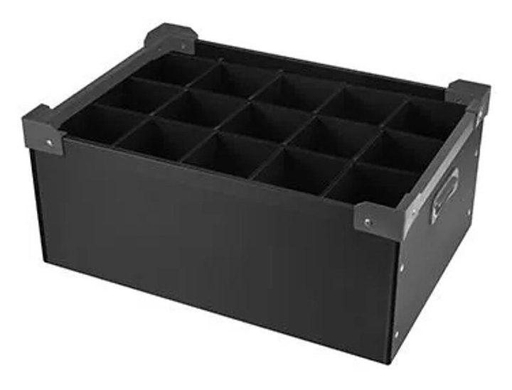 Ящик для хранения посуды для напитков P.L. Barbossa Bad Guys Bar GLSG0010 предназначен для хранения и перевозки посуды для напитков с крышкой в барах, ресторанах и кафе. Модель оснащена двумя встроенными ручками и четырьмя уголками для штабелирования. Изделие выполнено из сотового поликарбоната, который легко моется и не впитывает запахов. Крышка входит в комплект. Особенности: