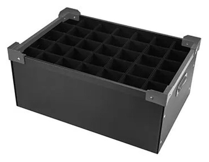 Ящик для хранения посуды для напитков P.L. Barbossa Bad Guys Bar GLSG0013 предназначен для хранения и перевозки посуды для напитков с крышкой в барах, ресторанах и кафе. Модель оснащена двумя встроенными ручками и четырьмя уголками для штабелирования. Изделие выполнено из сотового поликарбоната, который легко моется и не впитывает запахов. Крышка входит в комплект. Особенности: