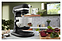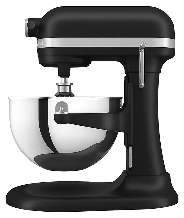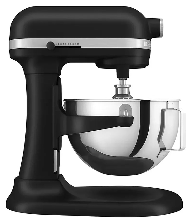 Настольный планетарный миксер KitchenAid Artisan 5KSM55SXXEBM серии Heavy Duty используется в домашних условиях для замеса теста различной консистенции, в том числе белкового, заварного, дрожжевого, бисквитного, а также приготовления пюре, кремов, муссов и соусов. Механизм вращения месильного органа аналогичен поступательно-вращательному движению планет, причем насадка вращается вдоль своей оси в противоположном направлении поступательному движению, таким образом ингредиенты тщательно перемешиваются в однородную массу. Модель оснащена электродвигателем переменного тока, механизмом подъема и опускания чаши с фиксирующими лапками, кабелем питания с вилкой и электромеханической панелью управления. Литой корпус обтекаемой формы выполнен из металла с покрытием износостойкой матовой эмалью черного цвета (Black Matte) и декоративной серебристой полосой с логотипом по периметру нижней части головки моторного блока, рычаги управления – из металла с полимерными рукоятками, чаша – из нержавеющей стали с серебристой полированной поверхностью, венчик – из нержавеющей стали, крюк и лопатка – из алюминия с термостойким нейлоновым покрытием. Комплектация: