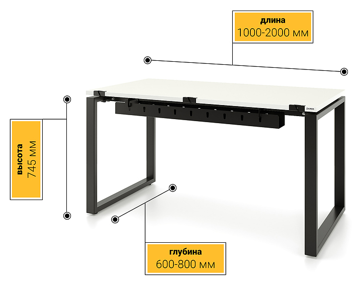 Прямой офисный стол ZAMM 60х30 серии Зета ТР используется для организации рабочего пространства в офисных помещениях. Коллекция отличается современным дизайном и сочетает в себе стиль и функциональность, создавая современное офисное пространство, стимулирующее продуктивность. Модель оснащена столешницей прямоугольной формы и О-образной опорой с подпятниками для компенсации неровностей пола. Каркас выполнен из холоднокатаной стали с покрытием цвета черный муар, столешница - из высококачественной ламинированной древесно-стружечной плиты (ЛДСП) с поверхностью белого цвета. В комплект поставки входят 3 пропуска для проводов (слева, по центру, справа), с их помощью можно с легкостью менять конфигурацию расположения устройств на столе, а также съёмный кабель-канал, позволяющий удобно и быстро проложить провода от розетки до сетевого фильтра (пилота), который питает все устройства на столе. Особенности: