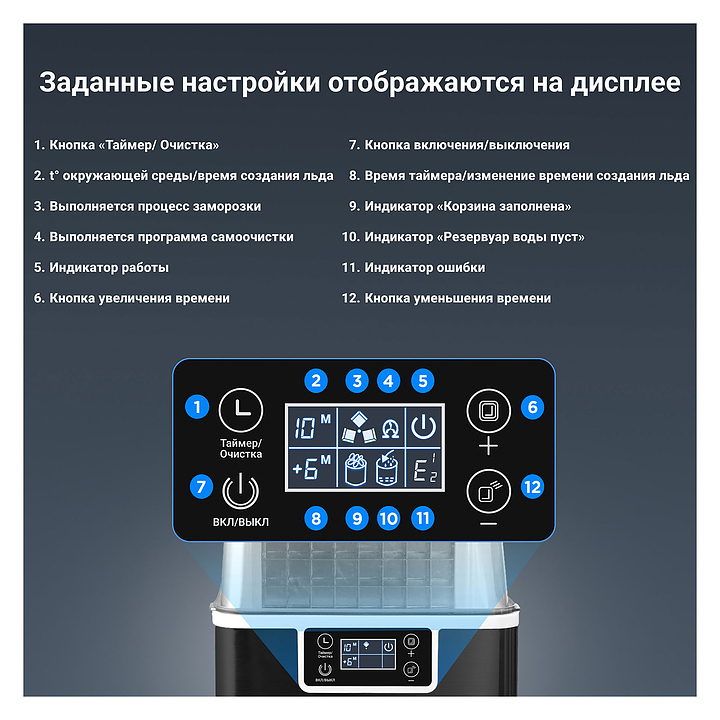 Портативный льдогенератор Tesler ICM-1201 используется на предприятиях общественного питания и торговли для производства пальчикового льда, необходимого для охлаждения напитков и хранения продуктов. Модель оснащена электронным управлением, ручкой для переноски и откидной прозрачной крышкой. Корпус выполнен из окрашенного металла. Особенности: