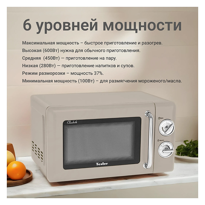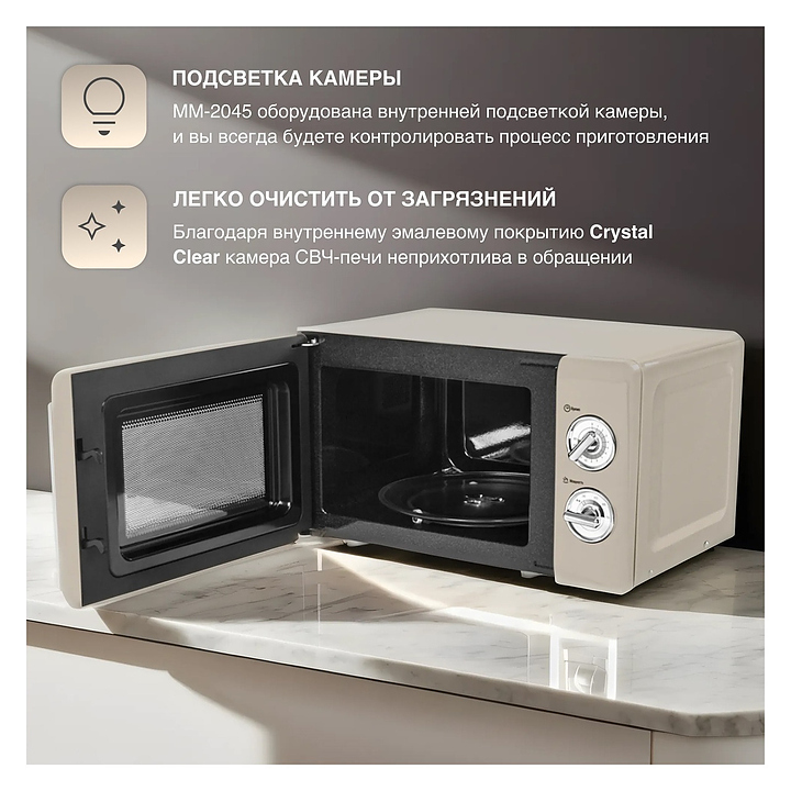 Микроволновая печь TESLER Elizabeth MM-2045 SAND GREY предназначена для приготовления пищи, подогрева готовых блюд и размораживания полуфабрикатов в частных домах, квартирах, отелях и офисах. Модель оснащена электронным управлением, автоменю на 6 программ, ЖК-дисплеем и встроенными часами и таймером. Корпус выполнен из высококачественной стали, поворотный столик выполнен из стекла, внутренняя отделка покрыта эмалью. Особенности: