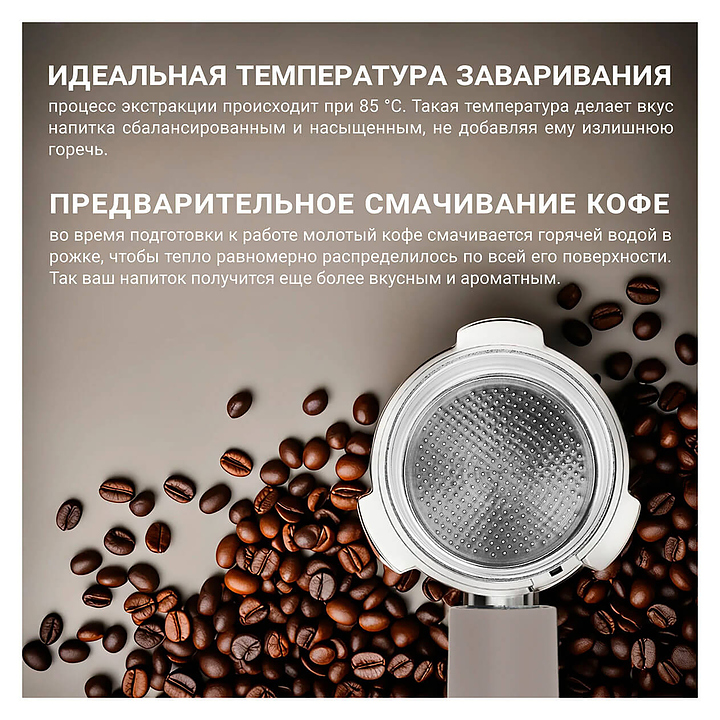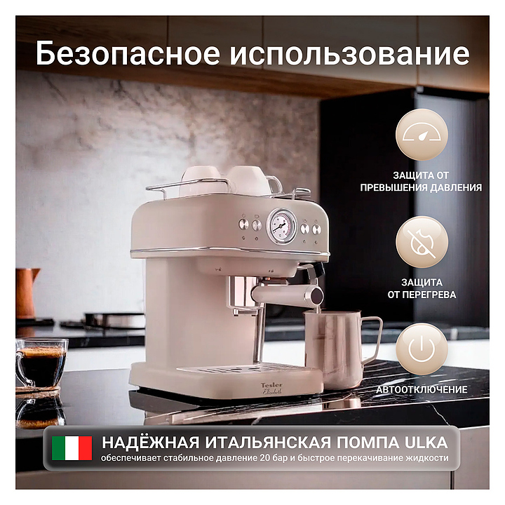 Рожковая кофеварка TESLER Elizabeth ECM-245 SAND GREY предназначена для приготовления эспрессо и напитков на его основе в гостиницах, офисах и домашних условиях. Модель оснащена оснащена мощной помпой ULKA на 20 бар, энергоэффективным термоблоком, капучинатором и встроенным манометром на корпусе кофеварки. Корпус выполнен из металла и пластика, с хромированным покрытием. Комплектация: кофеварка, фильтр для 1 чашки - 1 шт, фильтр для 2 чашек - 1 шт, адаптер для капсул Nespresso, рожок (держатель фильтра), мерная ложка - темпер - 1 шт, русскоязычное руководство по эксплуатации. Особенности: