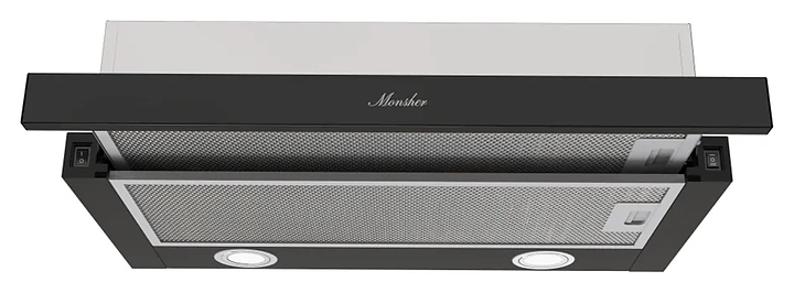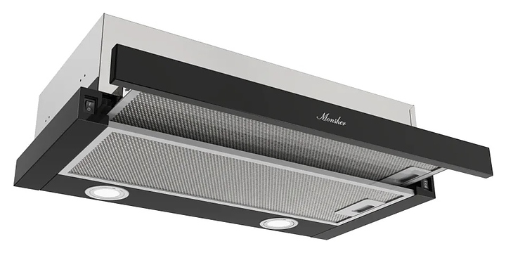 Встраиваемая кухонная вытяжка Monsher Laura 60 Noir предназначена для очистки воздуха от продуктов горения, копоти и запахов в процессе приготовления пищи путем принудительной вентиляции в домашних условиях. Модель оснащена вентилятором с электродвигателем, кабелем питания, 2 круглыми светильниками и панелью управления с функциональными клавишами колыбельного типа. Короб выполнен из стали с поверхностью цвета нержавеющая сталь, фасадная панель прямоугольной формы и козырек выдвижной секции – из стали с покрытием термостойкой эмалью черного цвета, жироулавливающий фильтр – из алюминия. Комплектация: