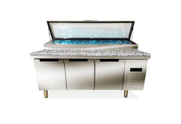 Холодильный стол CLSY Saladetta 180 (камень) предназначен для обработки ингредиентов в процессе приготовления блюд, а также кратковременного хранения скоропортящихся продуктов и напитков на предприятиях общественного питания и торговли. Модель оснащена салат-баром (саладетта) с прозрачной крышкой и каменной столешницей, его можно использовать для приготовления пиццы, шаурмы, салатов и др. Гастроемкости идут в комплекте. Корпус и столешница выполнены из нержавеющей стали AISI 201. Комплектация: