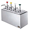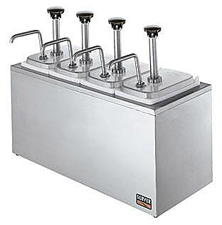 Дозатор Server SB-4 83700 (термоизолированный корпус) с 4 насосами-дозаторами (артикул CP-F 83330) из нержавеющей стали и 4 ёмкостями (артикул 82557) из полупрозрачного полипропилена, с основанием из нержавеющей стали предназначена для хранения, дозирования и подачи соусов, нуждающихся в охлаждении. Для охлаждения можно использовать эвтектический пакет льда (артикул 94141, в комплект не входит) из расчёта 1 пакет на 1 гастроёмкость, специальные ёмкости HoldCold (в комплект не входят) или обычный лёд. Оборудование можно использовать для подачи густых (кетчуп, горчица, майонез, заправка для салата, барбекю) и неоднородных (тартар, тысяча островов) соусов. Изоляция предотвращает образование конденсата. На матовой поверхности корпуса практически не видны следы от пальцев. Характеристики: