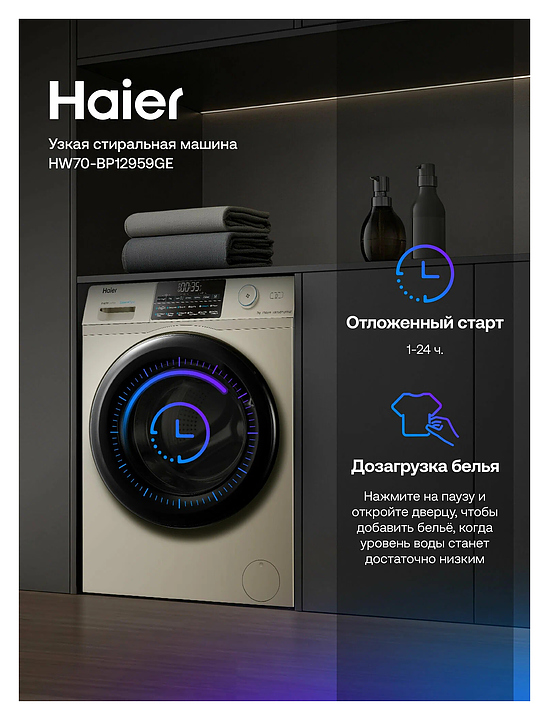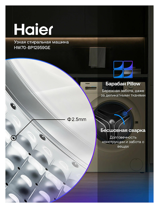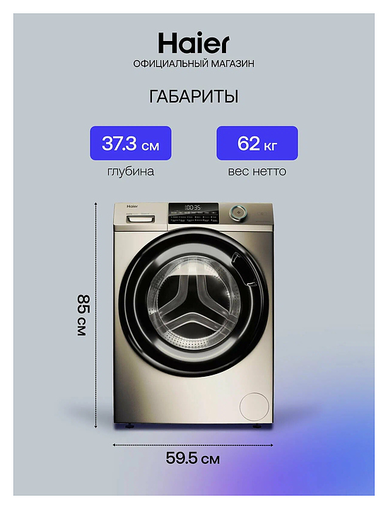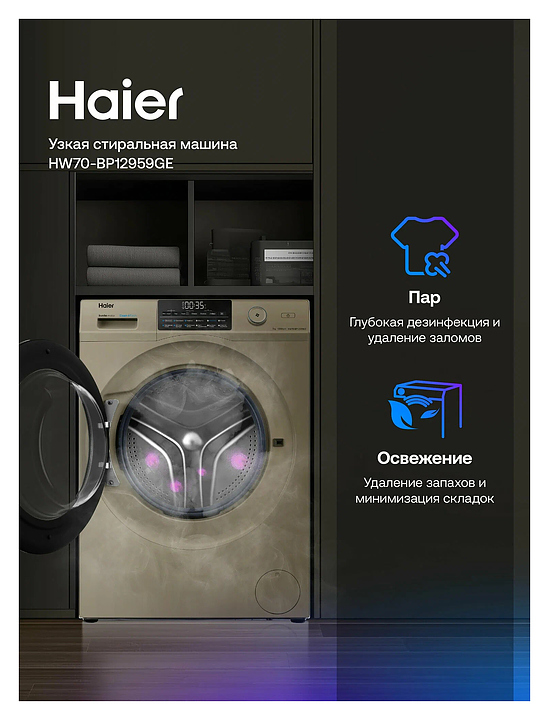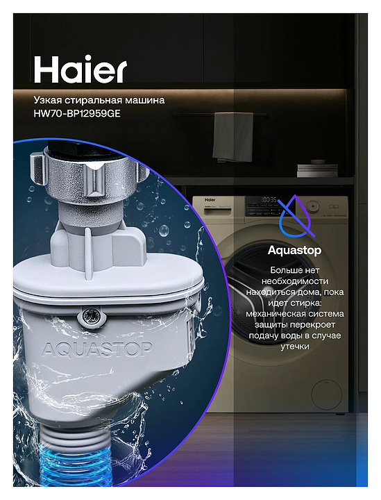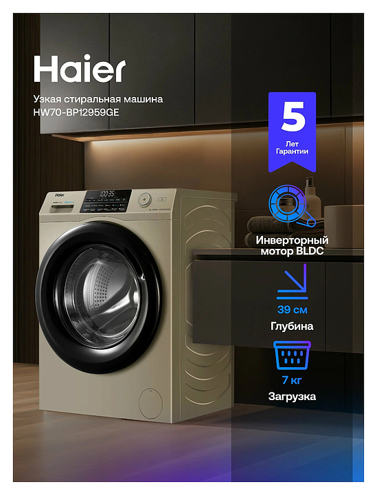 Стиральная машина Haier HW70-BP12959GE используется в квартирах и частных домах для стирки, полоскания и отжима белья, ткани и одежды. Модель оснащена фронтальной загрузкой, сенсорным управлением и цветным LED дисплеем. Инверторный мотор обеспечивает тихую работу и экономит электроэнергию. Применение функции i-Time автоматически оптимизирует настройки времени для уже выбранной программы стирки, ультрафиолетовая обработка удаляет аллергены и вирусы. Манжета люка и лоток всегда остаются чистыми благодаря автоматическому промыванию направленными струями воды Smart Dual Spray. Защита от протечек Aquastop гарантирует безопасную эксплуатацию. Антибактериальная обработка ABT манжеты люка и кюветы обеспечивает предотвращение размножения бактерий и плесени. Материал барабана нержавеющая сталь, материал корпуса крашеная сталь. Особенности: