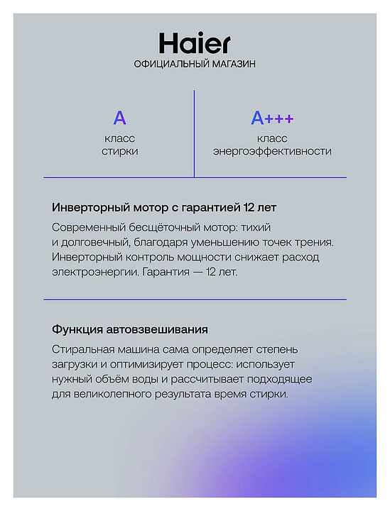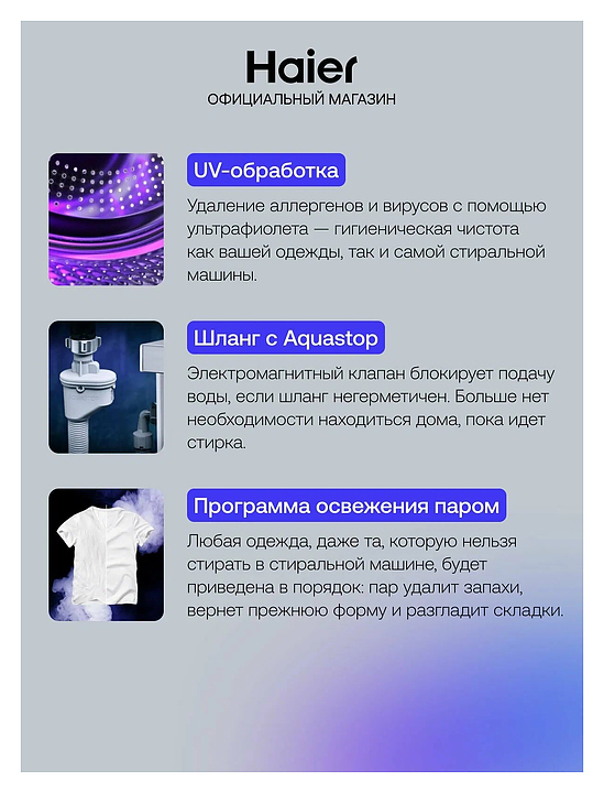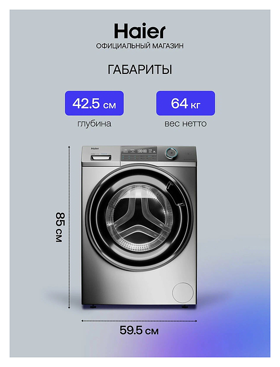 Стиральная машина Haier HW80-BP14969BS используется в квартирах и частных домах для стирки, полоскания и отжима белья, ткани и одежды. Модель оснащена фронтальной загрузкой, сенсорным управлением и цветным LED дисплеем. Инверторный мотор обеспечивает тихую работу и экономит электроэнергию. Применение функции i-Time автоматически оптимизирует настройки времени для уже выбранной программы стирки, ультрафиолетовая обработка удаляет аллергены и вирусы. Манжета люка и лоток всегда остаются чистыми благодаря автоматическому промыванию направленными струями воды Smart Dual Spray. Защита от протечек Aquastop гарантирует безопасную эксплуатацию. Антибактериальная обработка ABT манжеты люка и кюветы обеспечивает предотвращение размножения бактерий и плесени. Материал барабана нержавеющая сталь, материал корпуса крашеная сталь. Особенности: