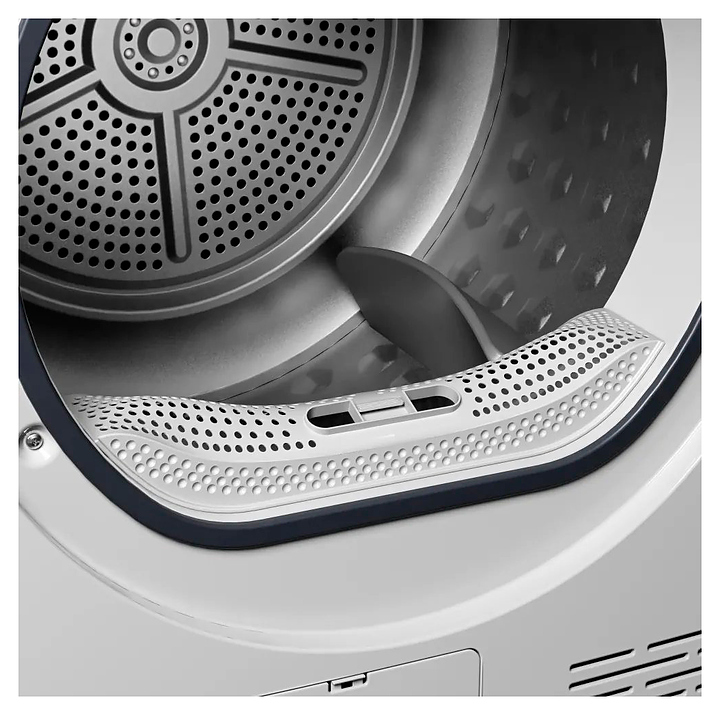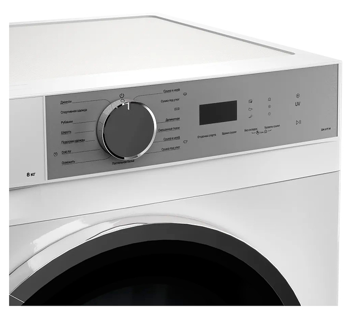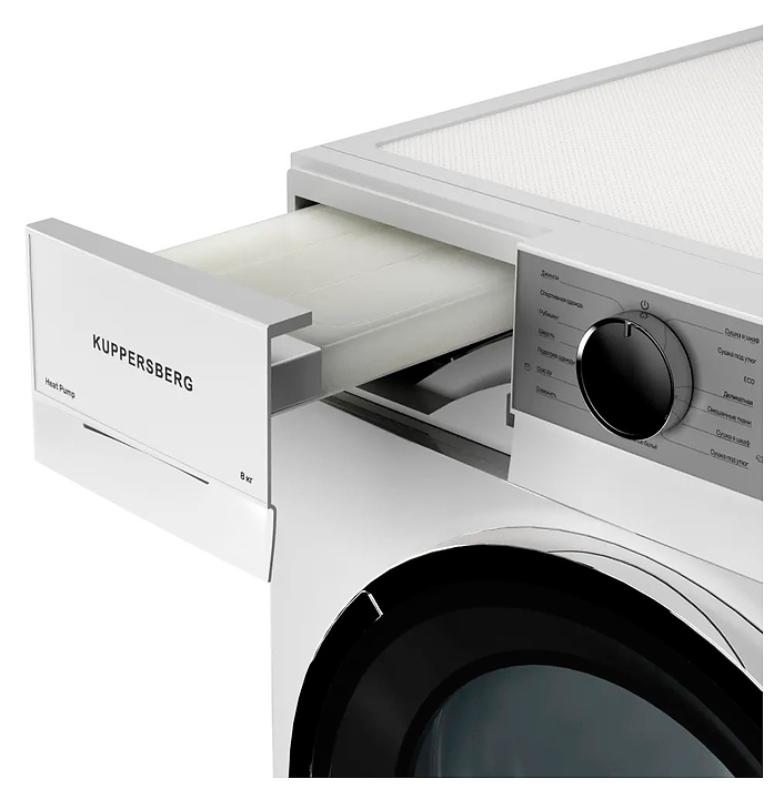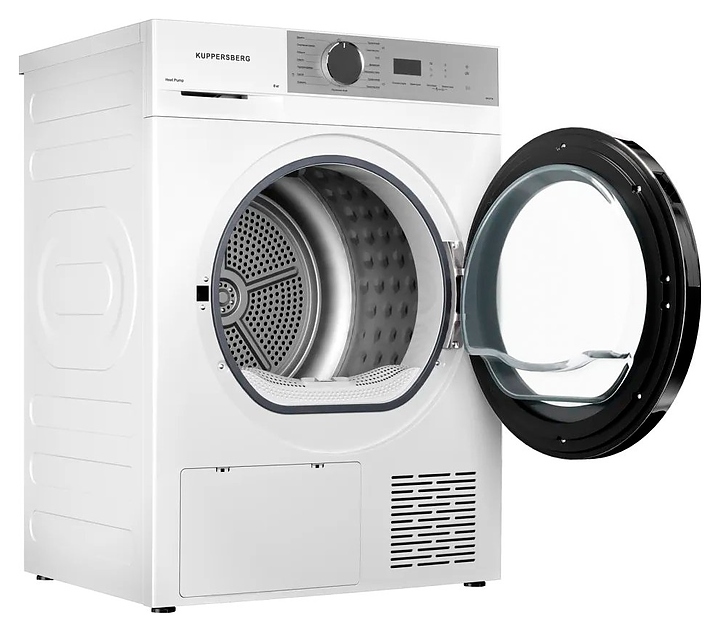 Автоматическая сушильная машина Kuppersberg DM 611 W используется в домашних условиях, а также небольших прачечных для сушки одежды, белья и тканей после стирки. Модель оснащена фронтальным загрузочным люком с правосторонней дверью со смотровым окном и интегрированной рукояткой, тепловым насосом, кабелем питания с вилкой, электронной панелью управления с поворотным переключателем, сенсорными функциональными клавишами, светодиодными индикаторами и цифровым дисплеем с белой подсветкой. Корпус выполнен из металла с антикоррозийным покрытием белого цвета, дверь люка – из прозрачного стекла с окантовкой черного цвета, внешняя крышка двери люка – из прозрачного стекла с окантовкой серебристого оттенка, барабан – из оцинкованной стали, бак – из термостойкого пластика, панель управления серого цвета, переключатель с серебристой окантовкой.
