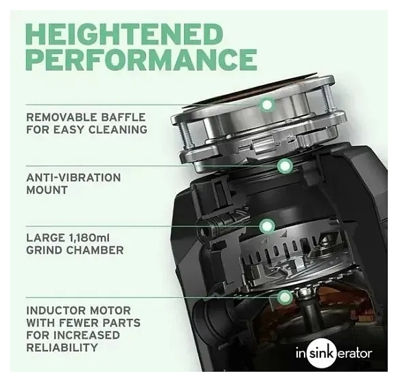 Измельчитель In Sink Erator Evolution Plus 1000 EC предназначен для переработки любых пищевых отходов, включая даже некрупные кости, избавления от неприятных запахов на кухне, способствуя гигиеничности утилизации отходов и экономиии времени на выносе мусора в загородных домах и квартирах. Прибор устанавливается непосредственно на кухонную мойку из любых материалов вместо штатной сливной арматуры и подсоединяется через сливное отверстие к системе канализации. Корпус выполнен из пластика и металла, дробильная камера, диск измельчителя, измельчающее кольцо и кулачки - из нержавеющей стали. Во время работы прибора (переработки отходов) желательно использовать ХОЛОДНУЮ воду. При использовании горячей воды, растопленнй жир может налипать на внутренней поверхности диспозера и сливных труб, вместо того, чтобы смываться в канализацию. Комплектация: