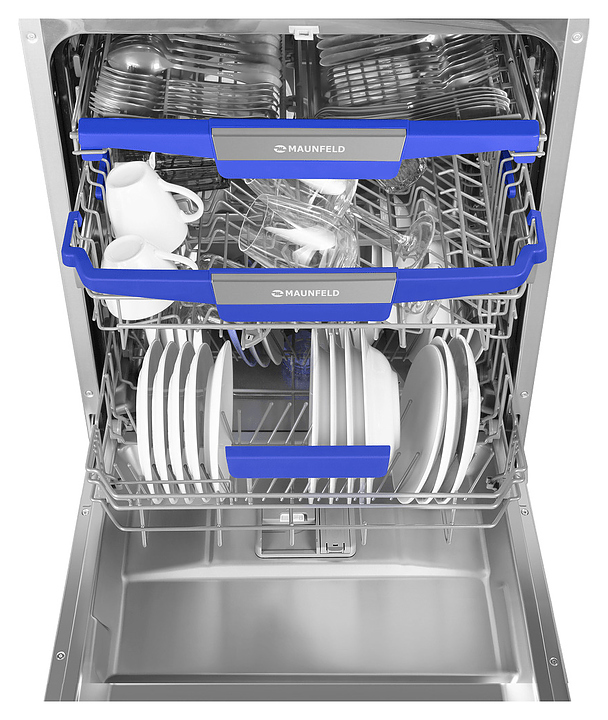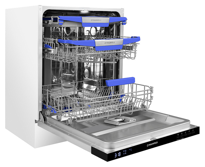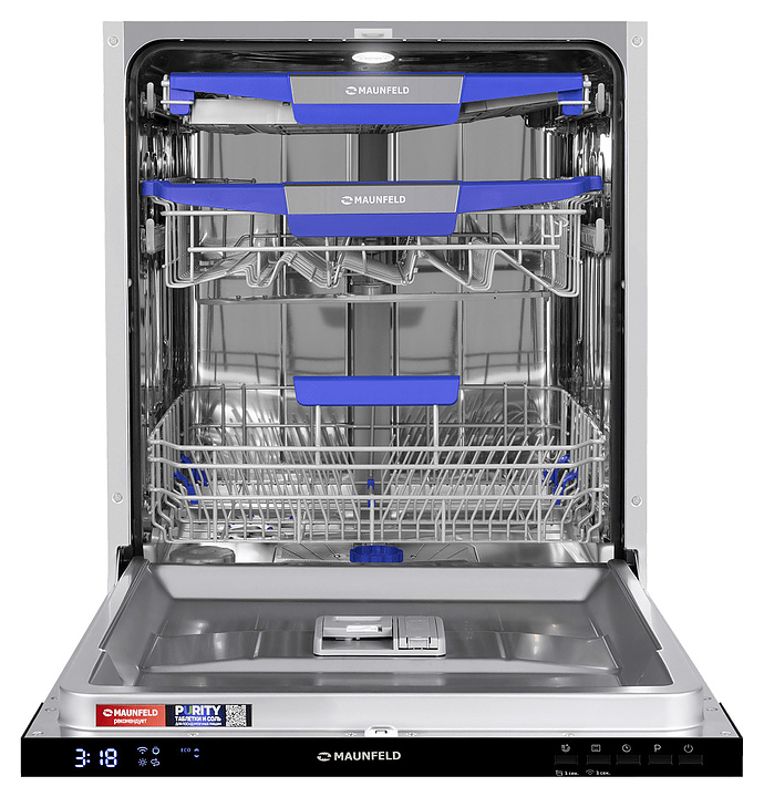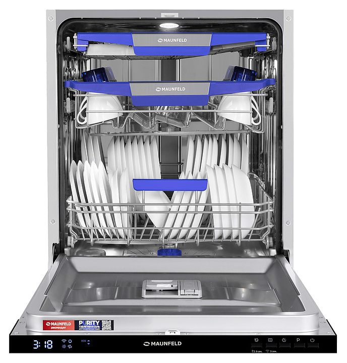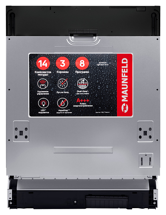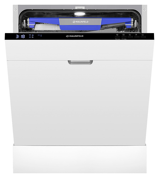 Встраиваемая посудомоечная машина Maunfeld MLP60230 Light Beam Wi-Fi предназначена для гигиенической обработки и последующей сушки различной посуды в гостиничных комплексах и домашних условиях. Модель оснащена камерой с откидной дверью с интегрированной рукояткой, 3 разбрызгивателями, дозаторами моющих и ополаскивающих средств, устройством умягчения воды, кабелем питания с вилкой, расположенной на верхнем торце двери электронной панелью управления с функциональными нажимными клавишами, светодиодными сигнальными лампами и цифровым дисплеем с голубой подсветкой индикации. Внутренняя облицовка камеры и двери выполнена из высококачественной нержавеющей стали, корпус – из металла с антикоррозийным покрытием, панель управления – из полимера черного цвета.