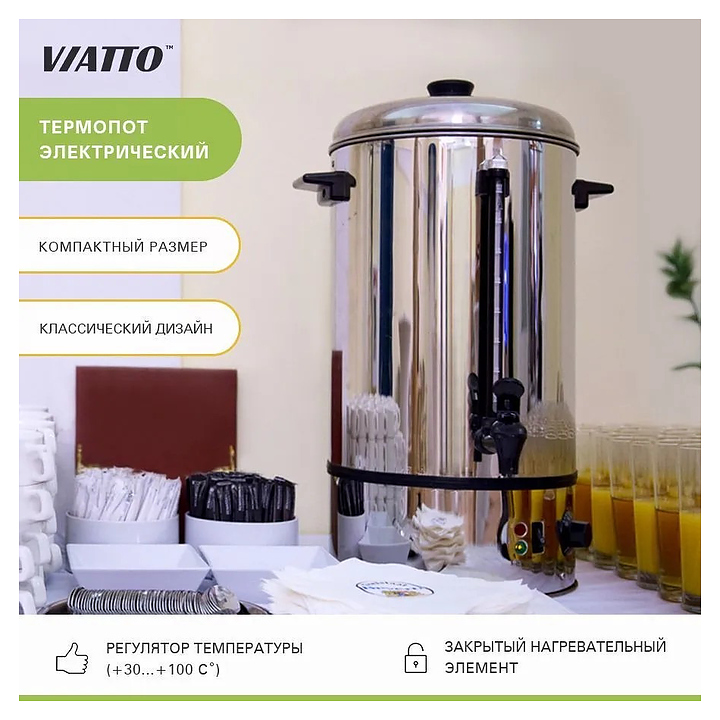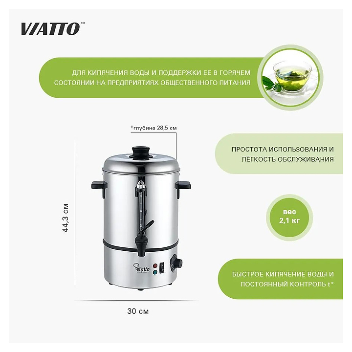 Кипятильник VIATTO VA-WB08SS предназначен для приготовления кипятка для варки гарниров, овощей, сосисок, пельменей и других продуктов питания, а также для заваривания и приготовления горячих напитков, стерилизации кухонной и столовой посуды, столовых приборов на предприятиях общественного питания и торговли. Модель оснащена закрытым нагревательным элементом. Корпус выполнен из нержавеющей стали. Особенности: