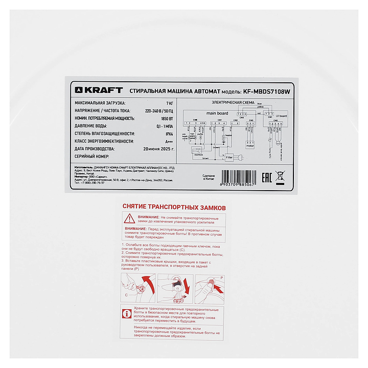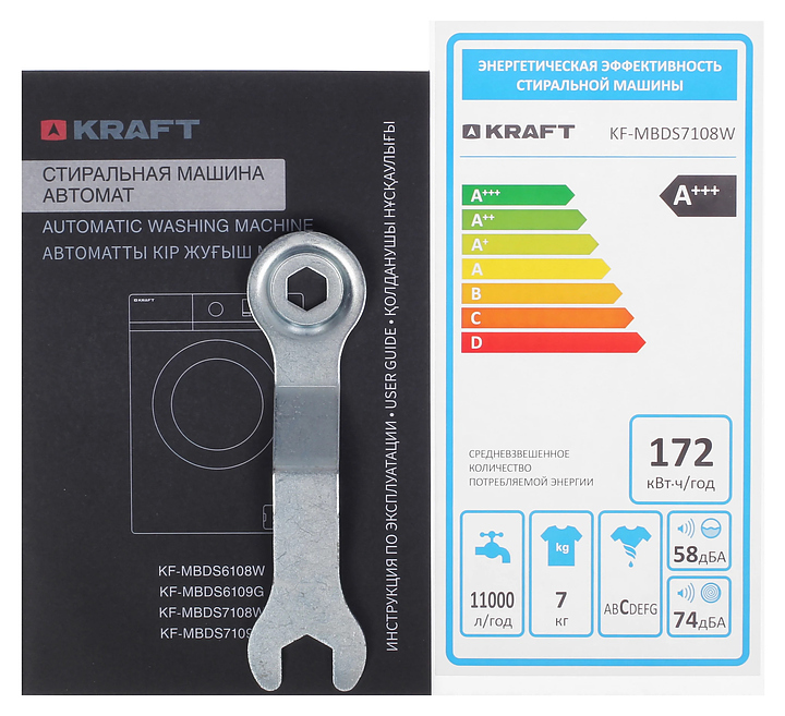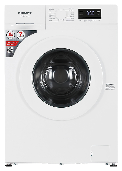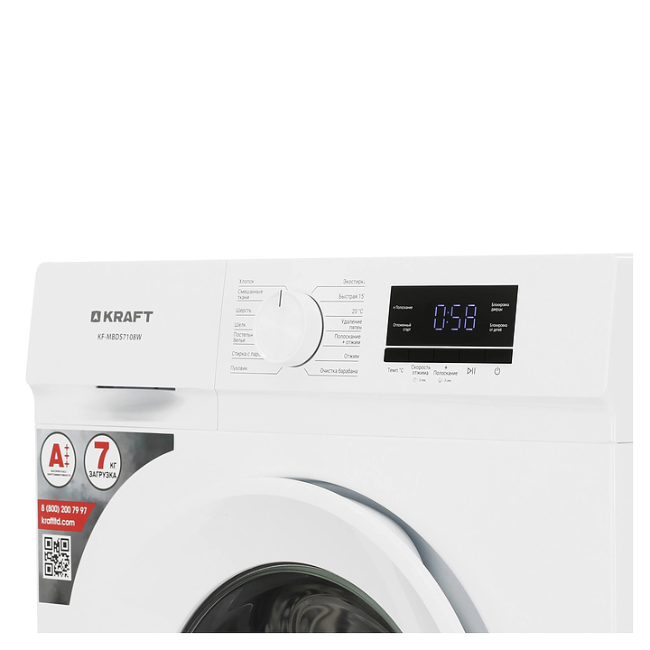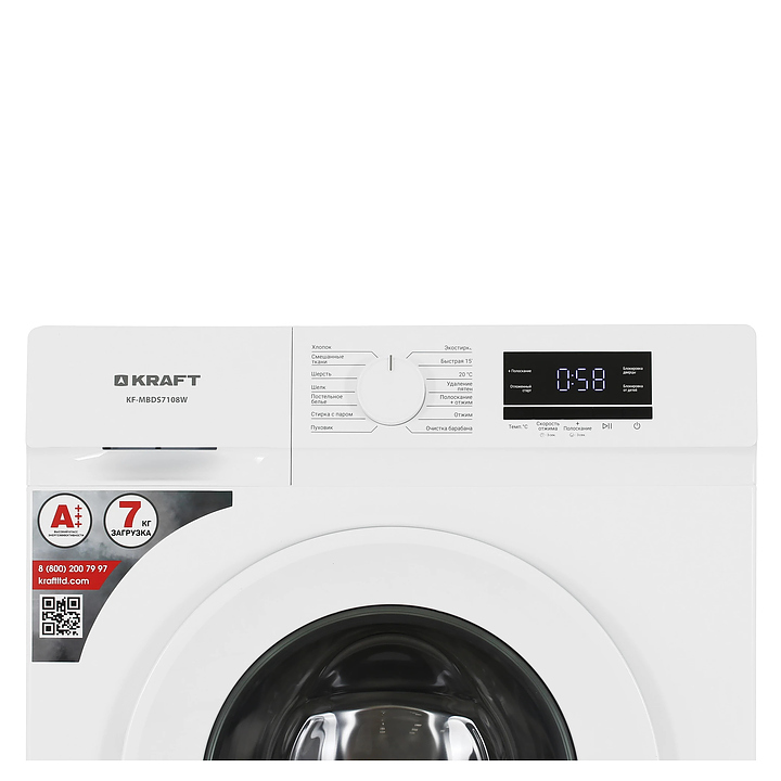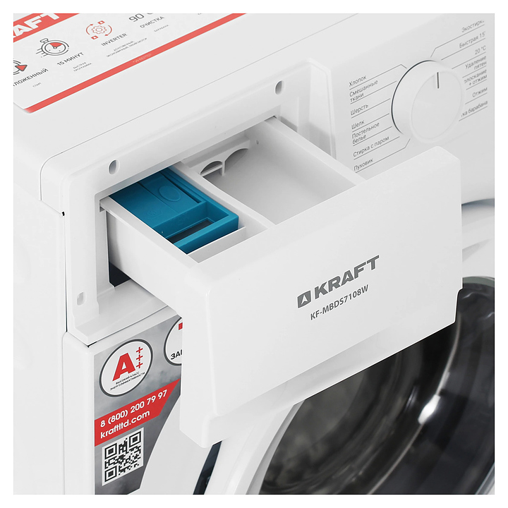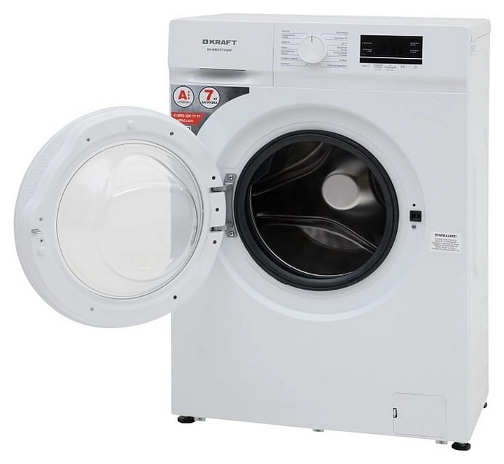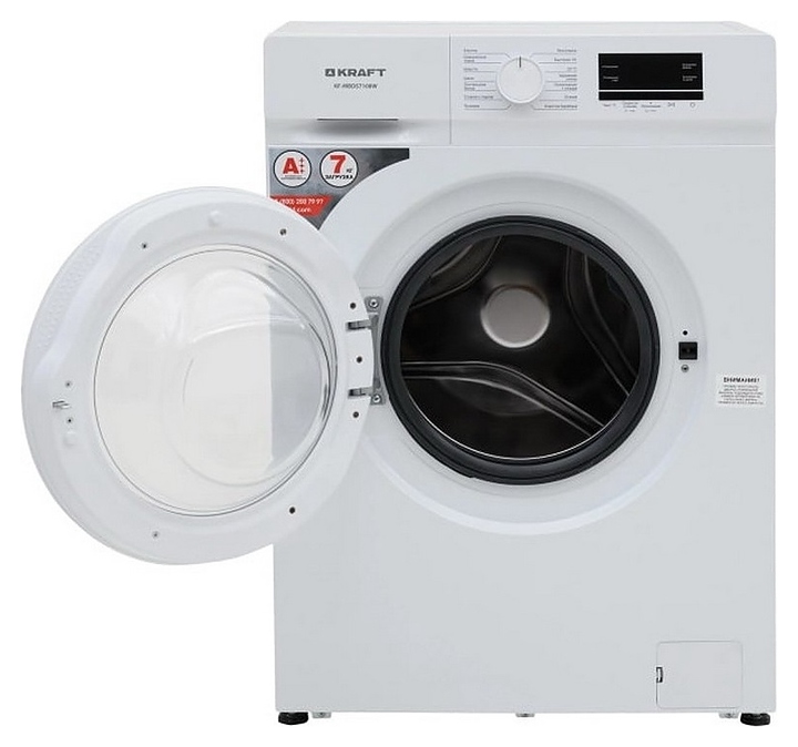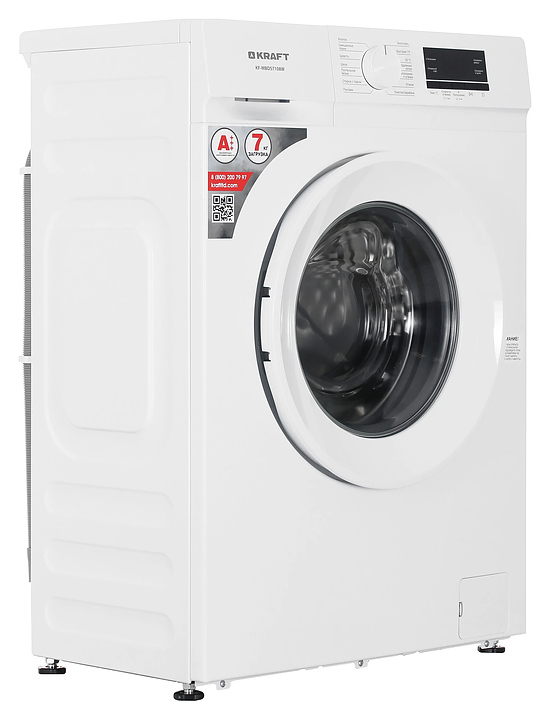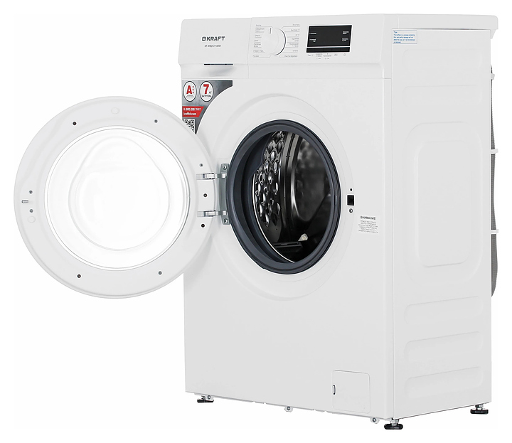 Автоматическая стиральная машина Kraft KF-MBDS7108W используется в домашних условиях, а также небольших прачечных для стирки, полоскания и отжима белья, одежды и тканей. Модель оснащена фронтальным загрузочным люком с левосторонней дверью со смотровым окном, съемным контейнером для моющих средств с 3 отсеками, кабелем питания с вилкой, электромеханической панелью управления с поворотным переключателем программ, нажимными функциональными клавишами, светодиодными сигнальными лампами и цифровым дисплеем с голубой подсветкой индикации. Корпус выполнен из металла с антикоррозийным покрытием белого цвета, крышка двери люка – из пластика с белой поверхностью и остеклением из прозрачного толстостенного стекла, барабан – из высококачественной нержавеющей стали, панель управления черного цвета.