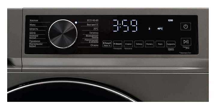 Цифровая индикация оставшегося до начала или завершения цикла времени и других параметров, светодиодные индикаторы активных функций, цифровых значений температуры воды и скорости отжима